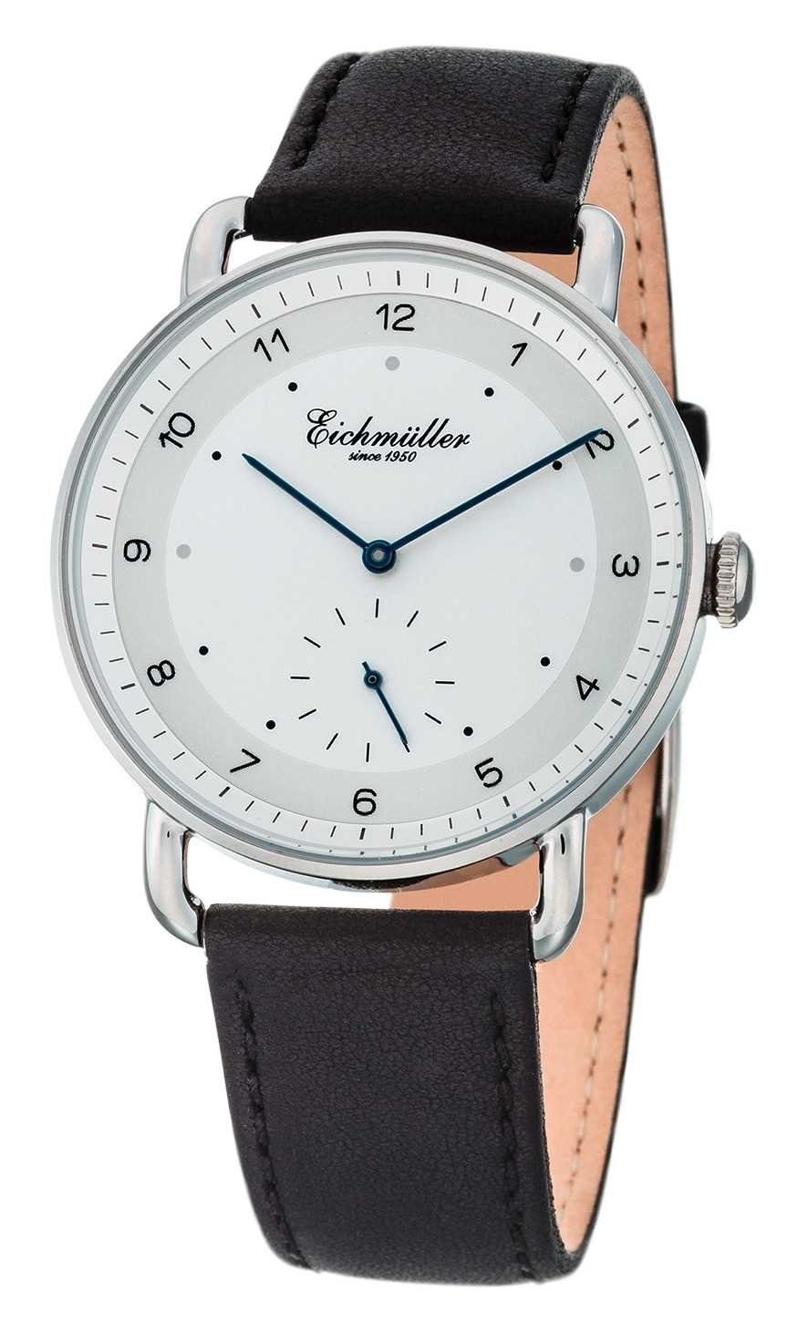 Stilvoller Zeitmesser von Eichmüller. Die Zeiger und Indizes sind gut erkennbar und werden von einem gehärteten Mineralglas geschützt. Das glatte und weiche Nappalederband fügt sich perfekt an das zeitlose Design der Uhr an. Das polierte Gehäuse aus Edelstahl hat eine Stärke von nur 7 mm. Zudem ist die Uhr auf bis zu 5 ATM wasserdicht. Der Totalisator oberhalb der 6 Uhr Position dient als Sekundenanzeiger.