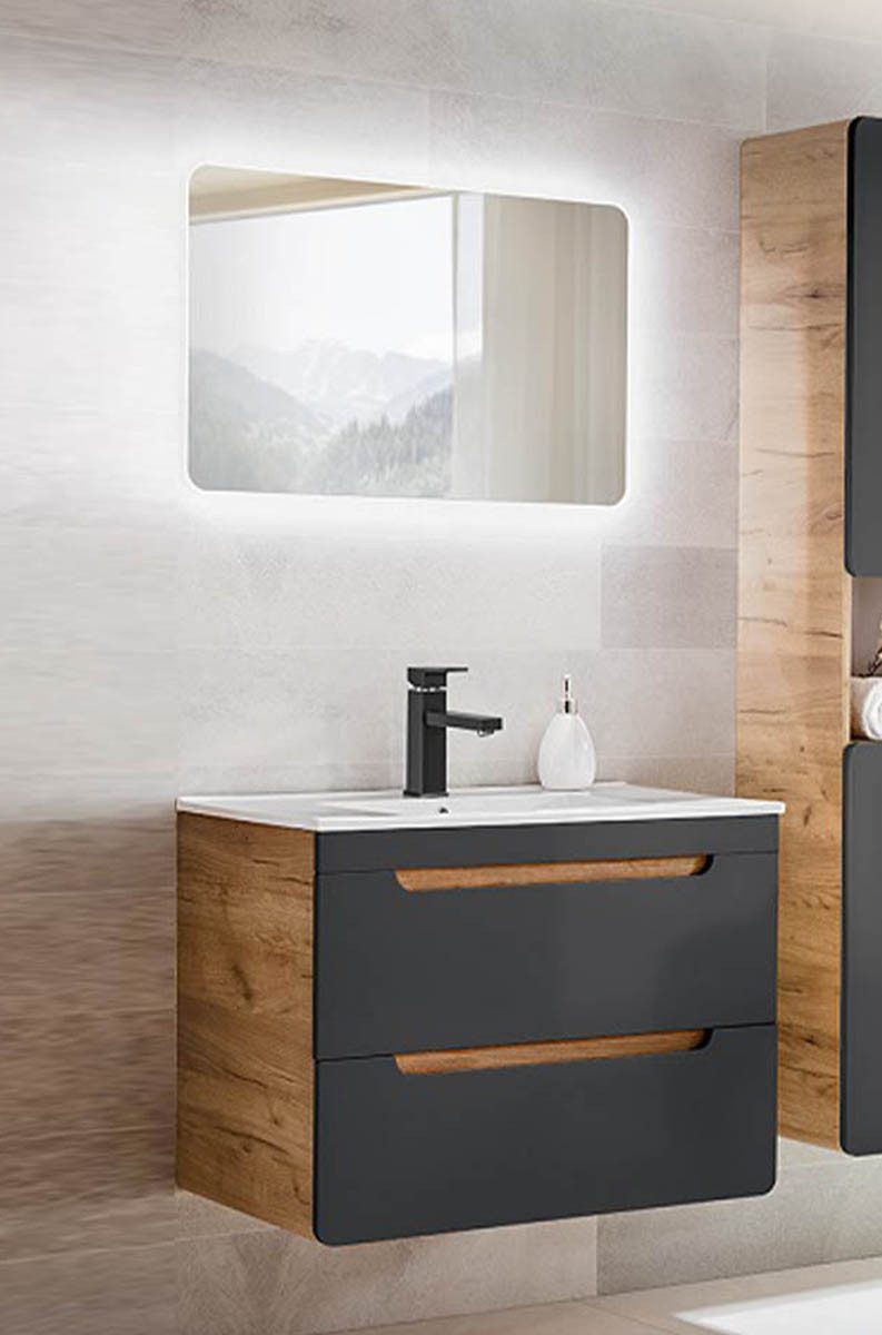 Aruba ist eine Bad-Kollektion, die durch ihr Design besticht - die Kombination aus soliden Karkassen mit filigranen, dunklen Fronten und Holzdetails machen die Möbel zu einem zentralen Element im Bad-Interieur. Die abgerundeten Korpus-Kanten sind immer wieder ein Hingucker! Es finden sich diverse Waschtische in verschiedenen Größen, dank denen jedes Badezimmer-Konzept individuellen Bedürfnissen angepasst werden kann.