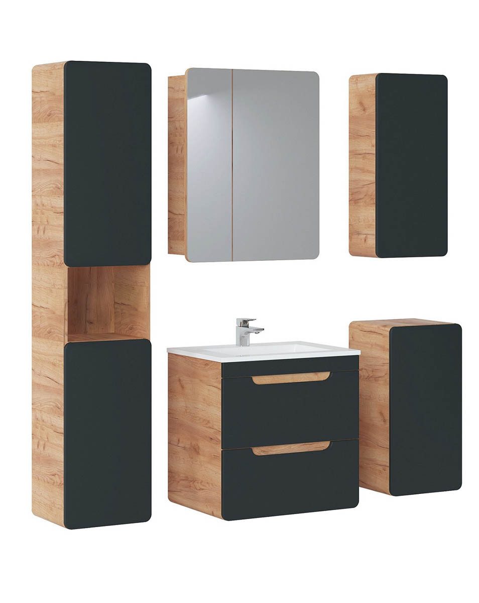 Set beinhaltet | Waschtisch Unterschrank, mit Keramikwaschbecken, Spiegelschrank, Hänge-und Seitenschrank, Hochschrank |