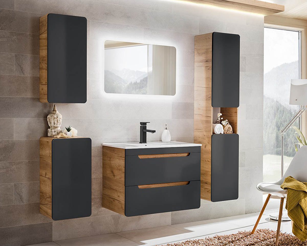 Aruba ist eine Bad-Kollektion, die durch ihr Design besticht - die Kombination aus soliden Karkassen mit filigranen, dunklen Fronten und Holzdetails machen die Möbel zu einem zentralen Element im Bad-Interieur. Die abgerundeten Korpus-Kanten sind immer wieder ein Hingucker! Es finden sich diverse Waschtische in verschiedenen Größen, dank denen jedes Badezimmer-Konzept individuellen Bedürfnissen angepasst werden kann.