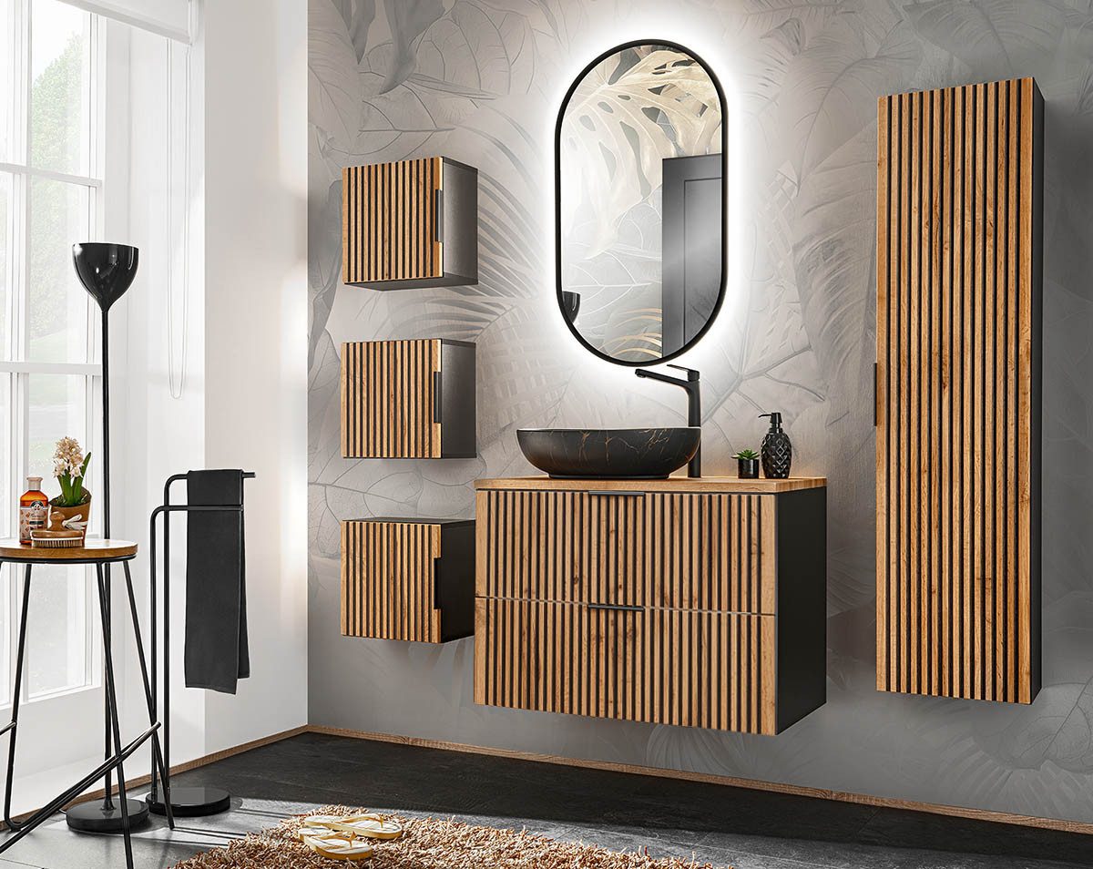 Einen fantastischen Kontrast haben die Designer der Badmöbel-Sets "tribune" hier geschaffen. Das kühle mattschwarz der Möbelkorpusse trifft auf die lebendig gemaserte, vom Ton sehr warme, Eiche im "Wotan" Look. Die echte Säge-Schnittkanten nachempfundene Holzoptik wirkt lebendig und schafft, im optischen Zusammenspiel mit den vertikal gefrästen Vertiefungen in Riemchenoptik, ein nie da gewesenes Raumerlebnis. Die Waschtische mit oder ohne Waschbecken sind in Größen von 60cm bis 160cm erhältlich und füllen damit jedes Bad. In Kombination mit den quadratischen Hänge- und den voluminösen Hochschränken ensteht Stauraum der gefällt!