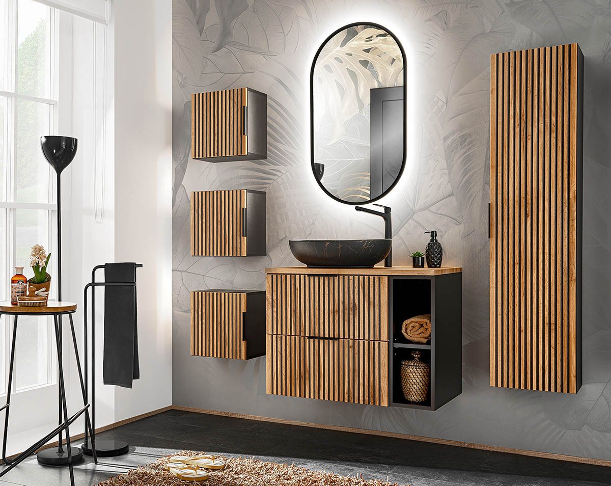 Einen fantastischen Kontrast haben die Designer der Badmöbel-Sets "tribune" hier geschaffen. Das kühle mattschwarz der Möbelkorpusse trifft auf die lebendig gemaserte, vom Ton sehr warme, Eiche im "Wotan" Look. Die echte Säge-Schnittkanten nachempfundene Holzoptik wirkt lebendig und schafft, im optischen Zusammenspiel mit den vertikal gefrästen Vertiefungen in Riemchenoptik, ein nie da gewesenes Raumerlebnis. Die Waschtische mit oder ohne Waschbecken sind in Größen von 60cm bis 160cm erhältlich und füllen damit jedes Bad. In Kombination mit den quadratischen Hänge- und den voluminösen Hochschränken ensteht Stauraum der gefällt!