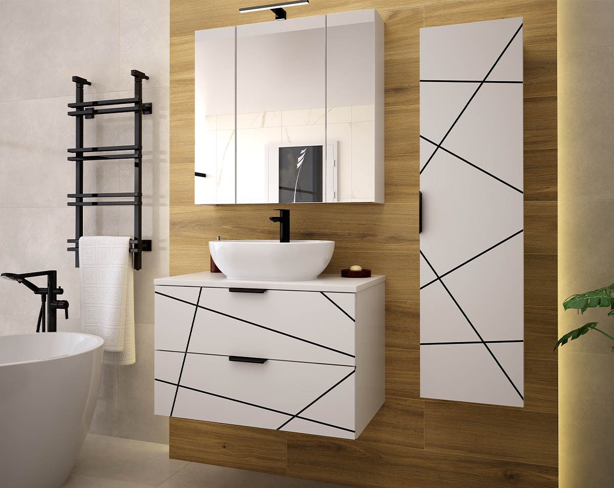 Das 3-teilige STRIATA Set in mattem Weiß wirkt besonders puristisch und aufgeräumt.. Der Waschtisch mit Aufsatzbecken hält die Oberfläche geschlossen und pflegeleicht; die 18mm MDF-Fronten zeigen feine, schwarz akzentuierte Diagonallinien – die charakteristische STRIATA-Signatur.
