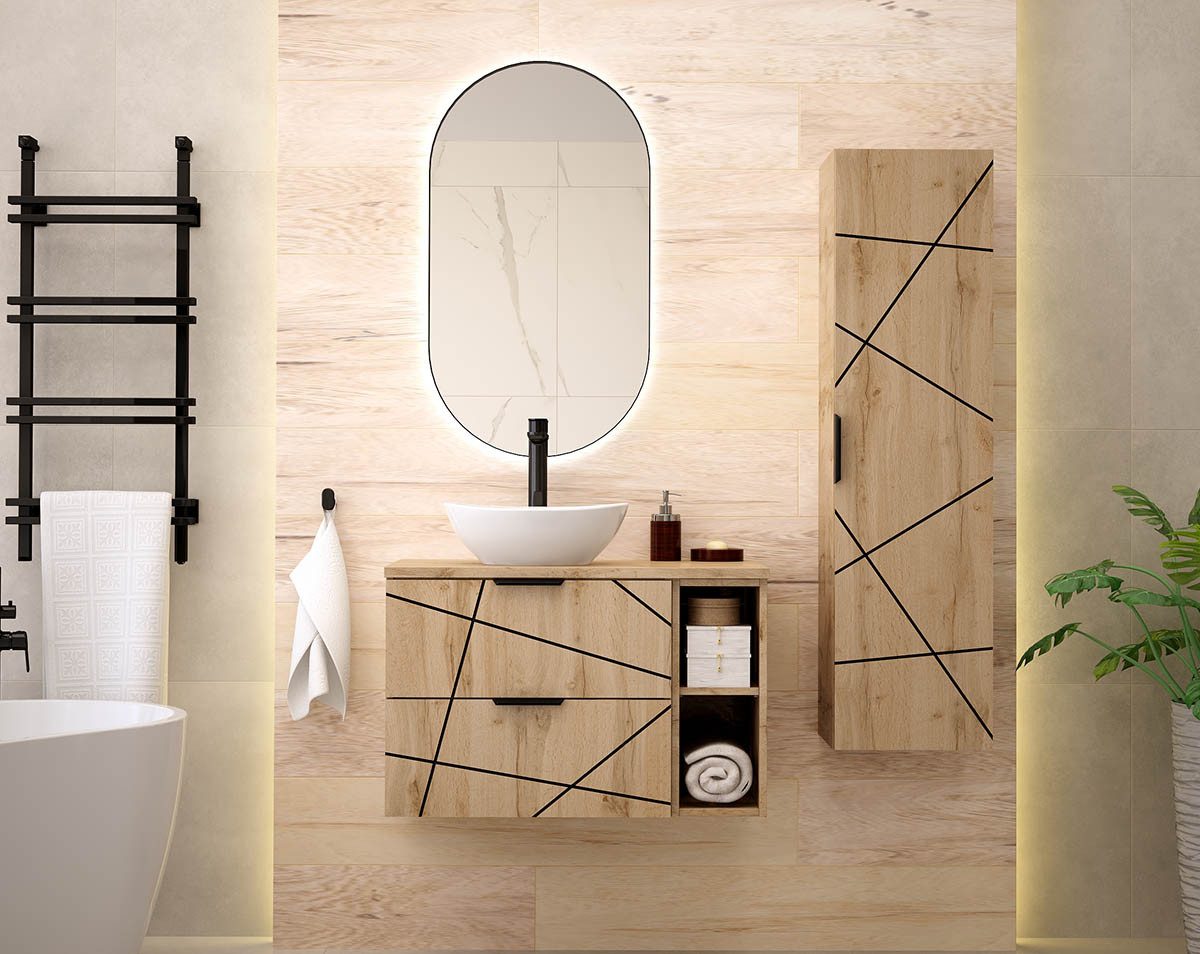 Das 3-teilige STRIATA Set in Wotan-Eiche verbindet warmes Holzbild mit grafischer Präzision. Der Waschtisch mit Aufsatzbecken hält die Oberfläche geschlossen und pflegeleicht; die 18mm MDF-Fronten zeigen feine, schwarz akzentuierte Diagonallinien – die charakteristische STRIATA-Signatur.