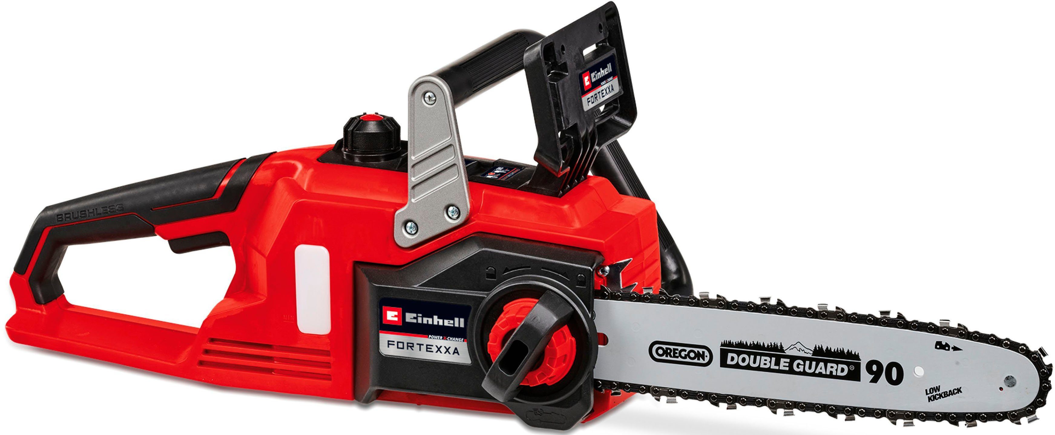Die Einhell Akku-Kettensäge FORTEXXA 18/30 ist ein leistungsstarkes Mitglied der flexiblen Power X-Change Familie. Angetrieben wird das Gerät von dem Einhell PurePOWER Brushless Motor. Dieser bürstenlose Motor bietet mehr Kraft und eine längere Laufzeit als herkömmliche Kohlebürsten-Motoren. Nach einer Online-Registrierung gelten 10 Jahre Garantie auf den Brushless-Motor. Mitsamt OREGON Qualitätsschwert und -Kette haben auch dicke Zweige und Äste der FORTEXXA kaum etwas entgegen zu setzen. Auch bei Arbeiten rund um Werk- und Kanthölzer sowie Brennholz leistet die Akku-Version einer Kettensäge beste Ergebnisse. Eine werkzeuglos einstellbare Kettenspannung und ein ebenso einfacher Kettenwechsel erleichtern die Handhabung. Der Kettenfänger und der Rückschlagschutz mit Sofort-Kettenbremse sorgen für die Sicherheit bei der Anwendung und die automatische Kettenschmierung über die große Öleinfüllöffnung für die einfache Pflege. Der robuste Krallenanschlag besteht aus Metall, der ergonomische Griff ist mit Softgrip für einen festen und sicheren Halt ausgerüstet. Zum Betrieb ist ein Power X-Change 18 Volt-Akku notwendig. Die innovative Power X-Change-Reihe von Einhell punktet mit starker Leistung und maximaler Flexibilität: Die Lithium-Ionen-Akkus sind unter den Geräten der Systemreihe von Einhell unbegrenzt austauschbar. Jeder System-Akku kann mit jedem Power X-Change-Gerät verwendet werden. Die Kettengeschwindigkeit ist anpassbar je nach Anwendung, d.h. es kann zwischen voller Leistung (8 m/s) und Eco-Modus (6 m/s) umgeschaltet werden. Mit der reduzierten Kettengeschwindigkeit wird die Akku-Laufzeit verlängert. Die Lieferung erfolgt ohne Akku und ohne Ladegerät, diese sind separat erhältlich, zum Beispiel als praktisches Starter-Set in verschiedenen Stärken.