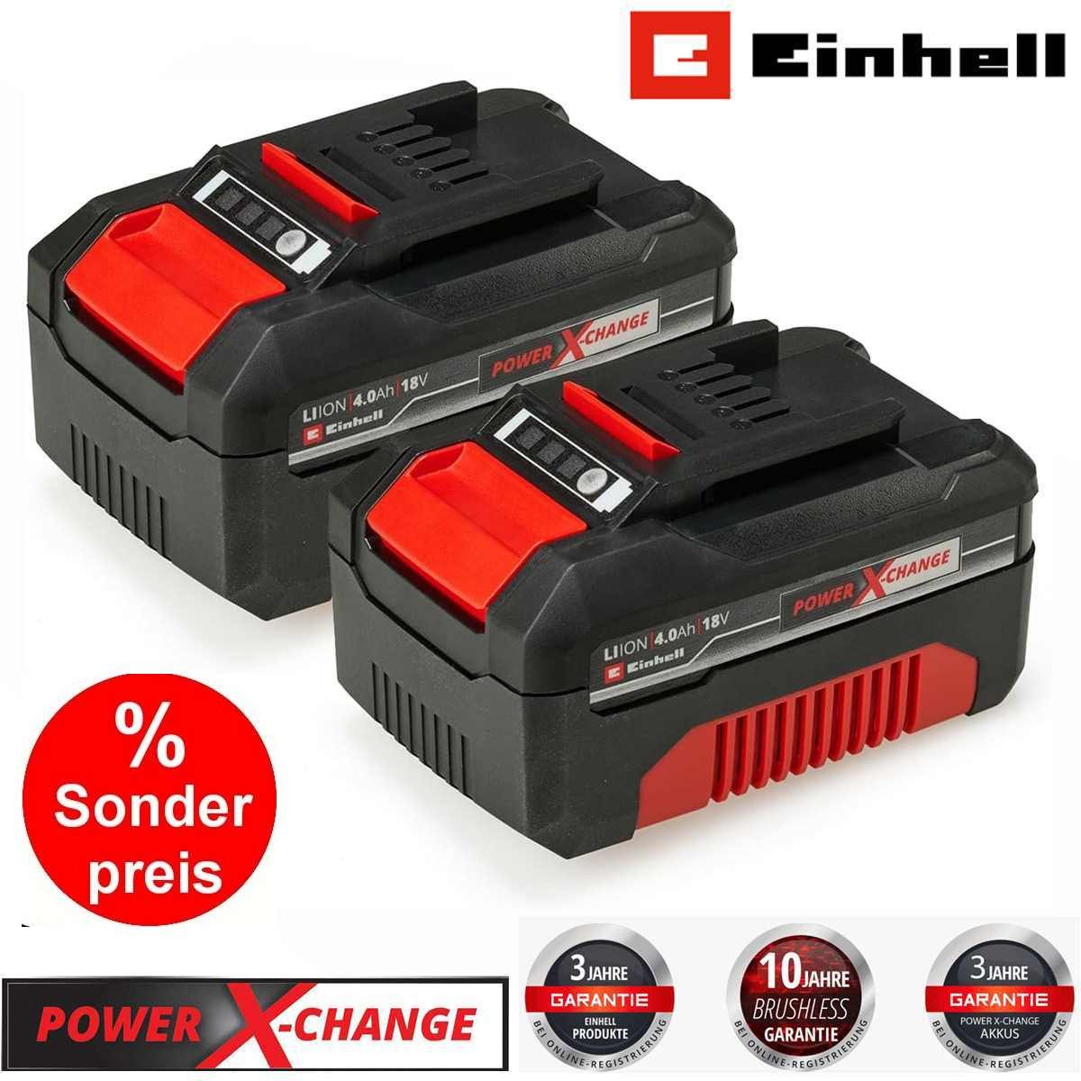 "Die 2x 18V 4,0 Ah Power X-Change Akkus gehören zum multifunktionalen und grenzenlos untereinander kombinierbaren Akkusystem Power X-Change von Einhell. Die universell einsetzbaren Power X-Change-Akkus versorgen alle Akkugeräte der gesamten Produktfamilie im Garten- und Werkstattbereich mit Kraft und Ausdauer. Die Vorteile für den Kunden liegen auf der Hand: Mit einem Akku und einem Ladegerät für alle Geräte spart man nicht nur bei der Anschaffung erhebliche Kosten, die universelle Einsatzmöglichkeit schont die Umwelt und bietet gleichzeitig Flexibilität in Haus und Garten. Auch gibt es keine Unordnung und kein Chaos mit unterschiedlichsten Akkus und Ladegeräten für jedes einzelne Gerät. Der 18V 4,0 Ah Power X-Change ist ein Basic-Akku der Power X-Change-Familie und auch geeignet für den TWIN-PACK Einsatz bei 36V-Anwendungen. Mit zwei 4,0Ah Akkus als TWIN-PACK kann man länger arbeiten und die Geräte können mit mehr Power (2x 18V = 36V) versorgt werden.