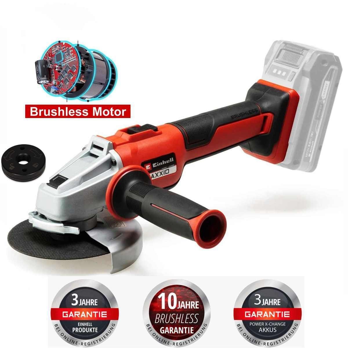 Der Einhell Professional Akku-Winkelschleifer AXXIO 18/125 Q bewährt sich als Helfer bei Arbeiten in Werkstatt, Haus und Garage. Kraftvoll, kabellos und komfortabel, das sind die Prädikate, auf die bei der Konzeption hoher Wert gelegt wurde. Der Winkelschleifer ist Mitglied der Power X-Change-Familie, bei der der Akku in allen Geräten der Systemreihe verwendet werden kann. Optimale Ergebnisse liefern der 2,5 Ah Akku und leistungsstärkere Akkus der Serie. Angetrieben wird das Gerät von dem Einhell PurePOWER Brushless Motor für mehr Kraft und längere Laufzeit. Nach Online-Registrierung gelten 10 Jahre Garantie auf den Motor. Dank seines leistungsstarken Motors liefert der Akku-Winkelschleifer die gleiche Leistung wie ein entsprechendes kabelgebundenes Gerät mit 700 W. Softstart und Wiederanlaufschutz dienen der erhöhten Anwendersicherheit. Angenehm arbeiten lässt es sich durch die schlanke Bauform mit ergonomischem Softgrip und Zusatzhandgriff. Die Entkoppelung von Motor und Getriebe sorgt für eine hohe Laufruhe. Der Scheibenschutz mit Schnellverstellung ermöglicht flexibles Arbeiten. Der Zusatzhandgriff ist flexibel in zwei Positionen montierbar. Mit der Quick-Fix Nut wird kein Stirnlochschlüssel mehr für den Trennscheiben-Wechsel benötigt: Der Wechsel erfolgt schnell und werkzeuglos. Der Akku-Winkelschleifer ist mit einem Überlastschutz ausgestattet. Auf Langlebigkeit wurde mit dem robusten Aluminium-Getriebegehäuse geachtet.