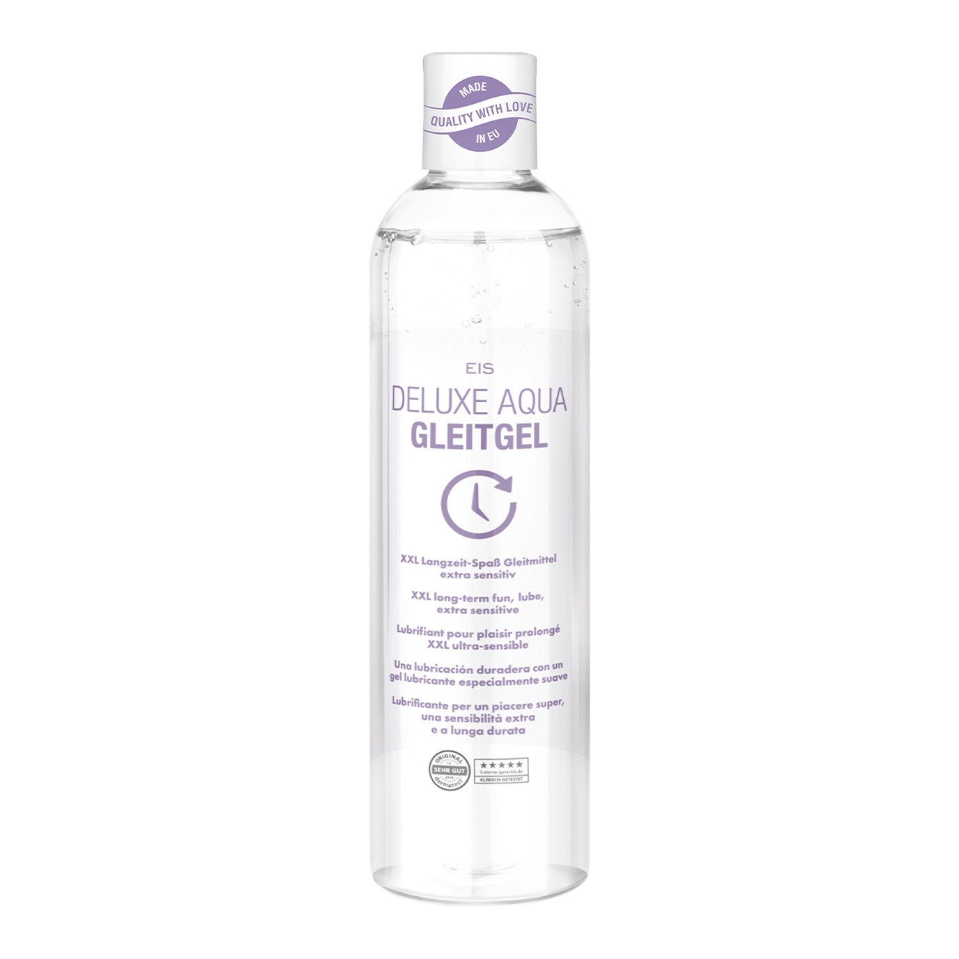 Deluxe Aqua Langzeit, extra sensitiv ist ein wasserbasiertes Gleitgel ohne Farb- und Duftstoffe. Es ist besonders langanhaltend gleitfreudig und eignet sich deshalb ideal für ausgiebige sowie anale Liebesspiele. Der beruhigende Wirkstoff Allantoin sorgt außerdem für einen zusätzlichen Pflegebonus und macht das Gleitgel zur richtigen Wahl bei empfindlicher Haut. Wird das Produkt zu gleich für Anal- & Vaginalverkehr verwendet, ist besonders auf Hygiene zu achten, denn Darmbakterien sollten keinesfalls in die Nähe der Vagina geraten.