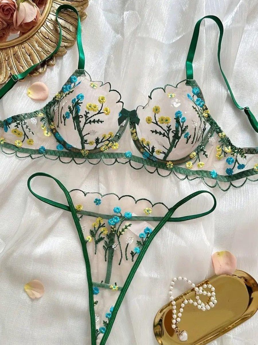 Entdecken Sie pure Eleganz mit unserem verführerischen 2-teiligen Dessous-Set. Dieses Set vereint Komfort und Sinnlichkeit auf einzigartige Weise. Der bügelfreie BH bietet maximalen Tragekomfort, passt sich Ihren Kurven perfekt an und unterstützt Ihre natürliche Form, ohne dabei einzuengen. Der dazugehörige Tanga rundet das Set harmonisch ab und sorgt für einen schmeichelhaften Sitz. Das Highlight des Sets sind die zarten Blumenstickereien, die jedem Teil eine romantische und feminine Note verleihen. Die Kombination aus hochwertigen Materialien wie weicher Spitze und elastischem Mesh garantiert ein luxuriöses Tragegefühl auf der Haut. Dieses Dessous-Set ist nicht nur unglaublich bequem, sondern auch unglaublich vielseitig. Tragen Sie es als verführerische Dessous unter einem transparenten Kleid, als bequeme Unterwäsche unter Ihrem Lieblingsoutfit oder einfach nur zum Verwöhnen Ihrer Sinne.