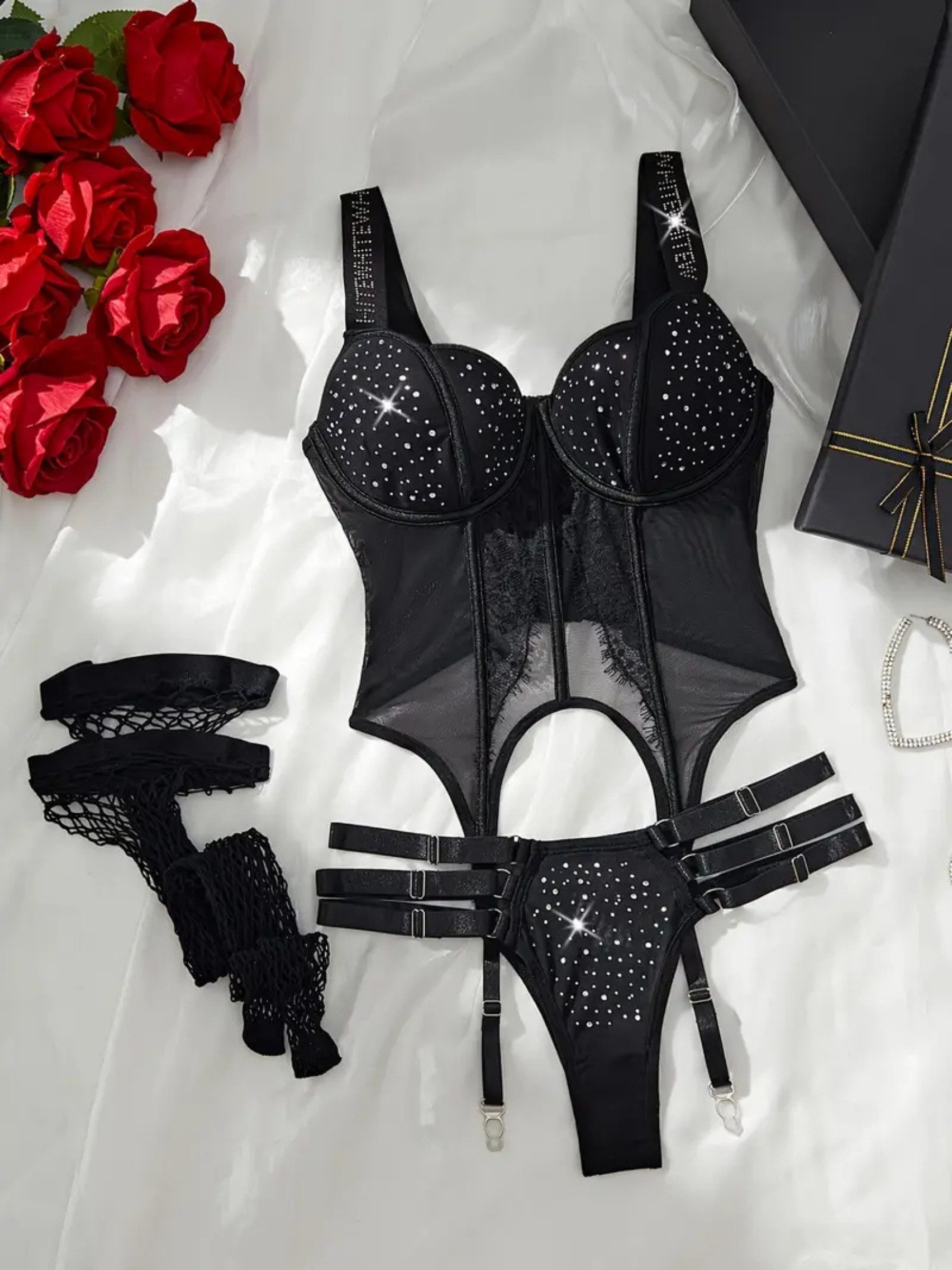Verleihen Sie Ihrem Auftritt glamourösen Glanz – mit diesem verführerischen Strass Lingerie-Set im Corsagenstil. Das 2-teilige Set besteht aus einem figurbetonten Body mit Bügel-BH und dazu passenden Netzstrümpfen, die Ihre Silhouette stilvoll in Szene setzen. Feine Glitzer-Details und funkelnde Strass-Akzente sorgen für einen edlen Look und machen dieses Dessous-Set zum absoluten Hingucker. Der formende Corsagen-Body bietet durch die eingearbeiteten Bügel optimalen Halt und zaubert ein traumhaftes Dekolleté. Transparente Mesh-Einsätze und raffinierte Cut-Outs unterstreichen die sinnliche Ausstrahlung, während elastische Materialien für hohen Tragekomfort sorgen. Ob als aufregendes Highlight für besondere Momente oder als stilvolle Überraschung – diese glamouröse Damenunterwäsche lässt keine Wünsche offen.Farbe | чёрный |