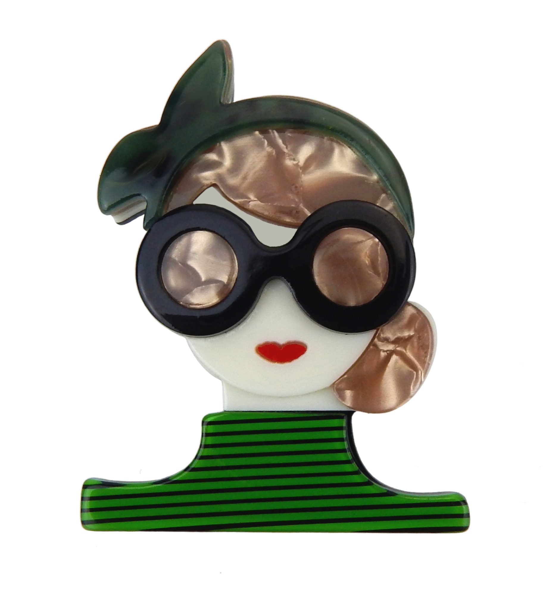 Besondere Merkmale | Brosche Frau Rockabella 4 Farben Rot Gold Grün oder Lila |