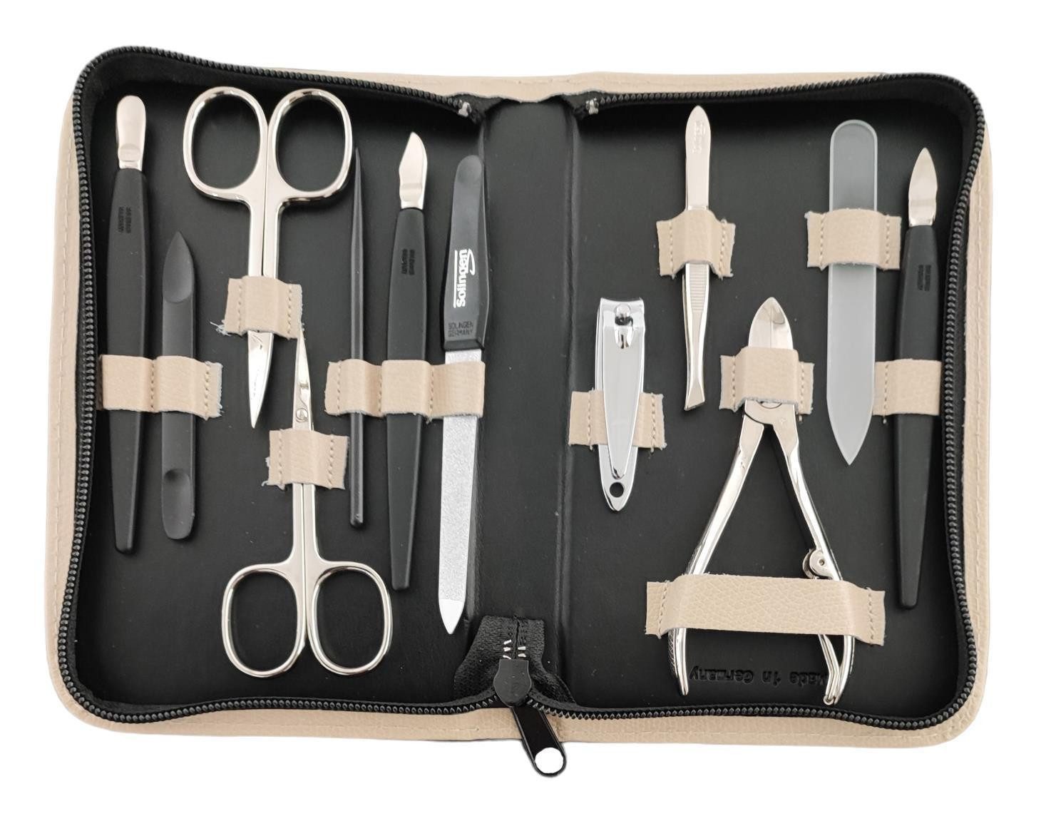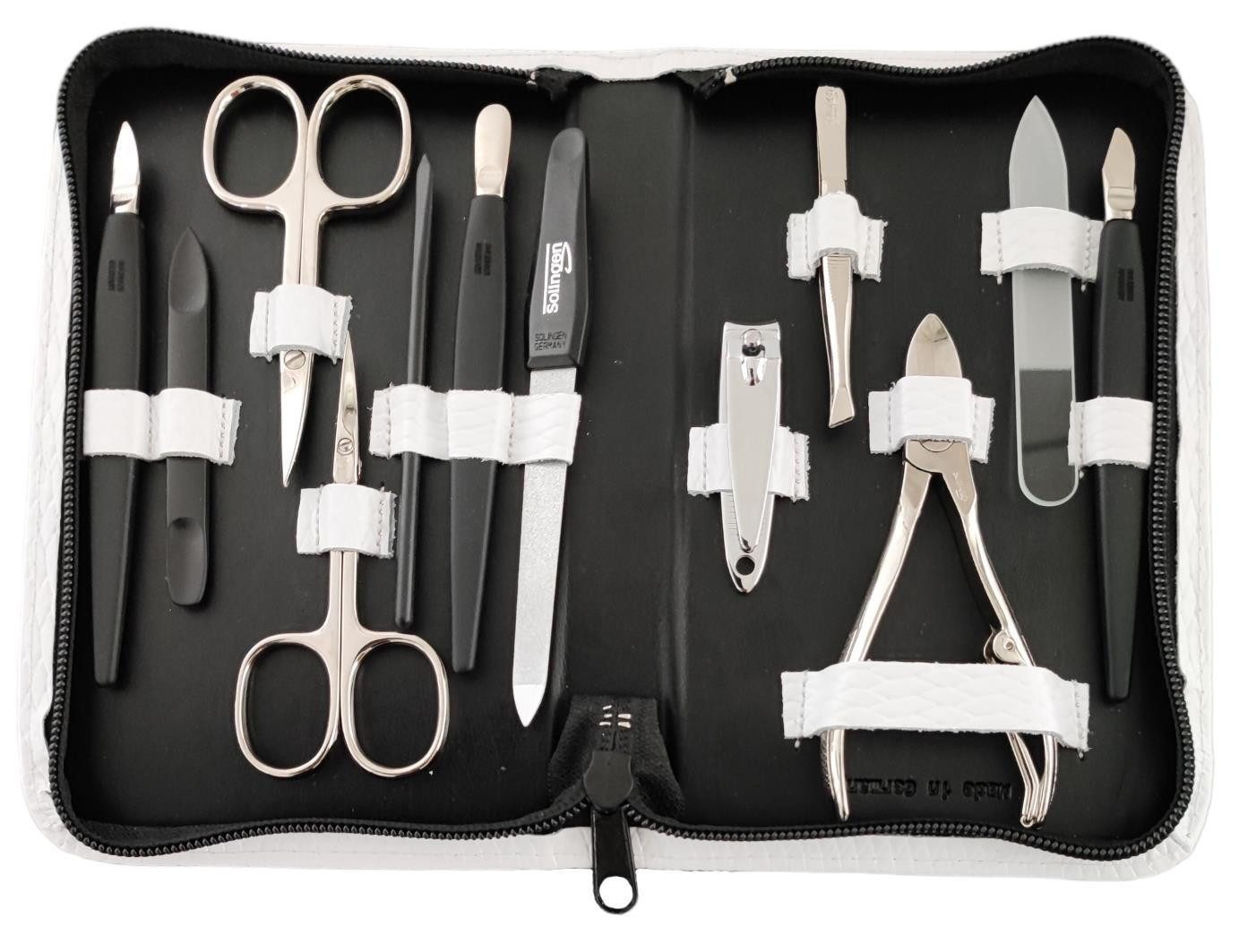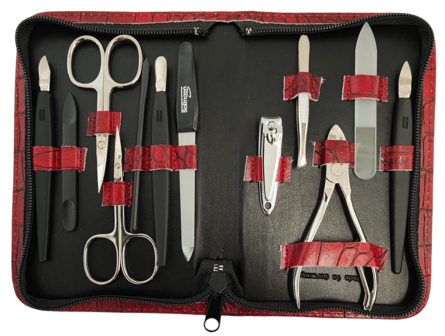 Gepflegte Hände sind Ausdruck von Stil und Persönlichkeit – das 12-teilige Maniküre-Set von EloModa vereint höchste Handwerkskunst mit zeitloser Eleganz. Jedes Instrument wurde mit größter Sorgfalt gefertigt, viele davon aus der weltbekannten Klingenstadt Solingen. Geschützt wird das Ensemble durch ein edles Etui aus echtem Leder – formschön, kompakt und ideal für zu Hause wie auf Reisen.