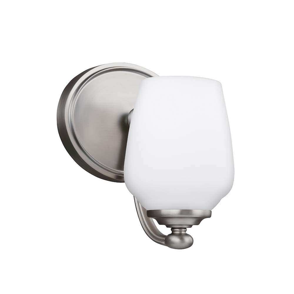 Weinglasförmige, opal geätzte Glasschirme inspirierten den Namen der Übergangskollektion Vintner von Feiss. Das geschwungene Design verwendet oben kleinere und unten etwas größere Arme. Ein dekoratives Kugeldetail fungiert als Sitzstange für jeden Glasschirm für eine elegant schlichte Silhouette in einem Satin-Nickel-Finish.