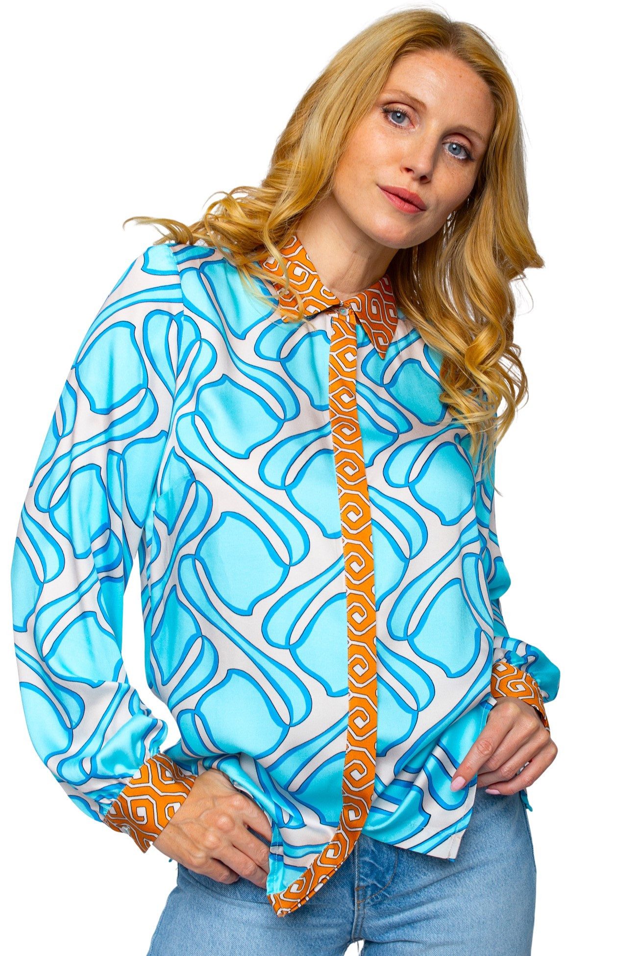 Die 1/1 Ärmel mit Manschette verleihen der Bluse eine zeitlose Note, während der angesagte Bordürenprint auf hochwertigem Viskose-Satin für einen modernen und stilvollen Akzent sorgt. Der sanfte Glanz des Materials und die lockere Passform machen diese Bluse zum perfekten Begleiter für entspannte Tage oder schicke Anlässe.