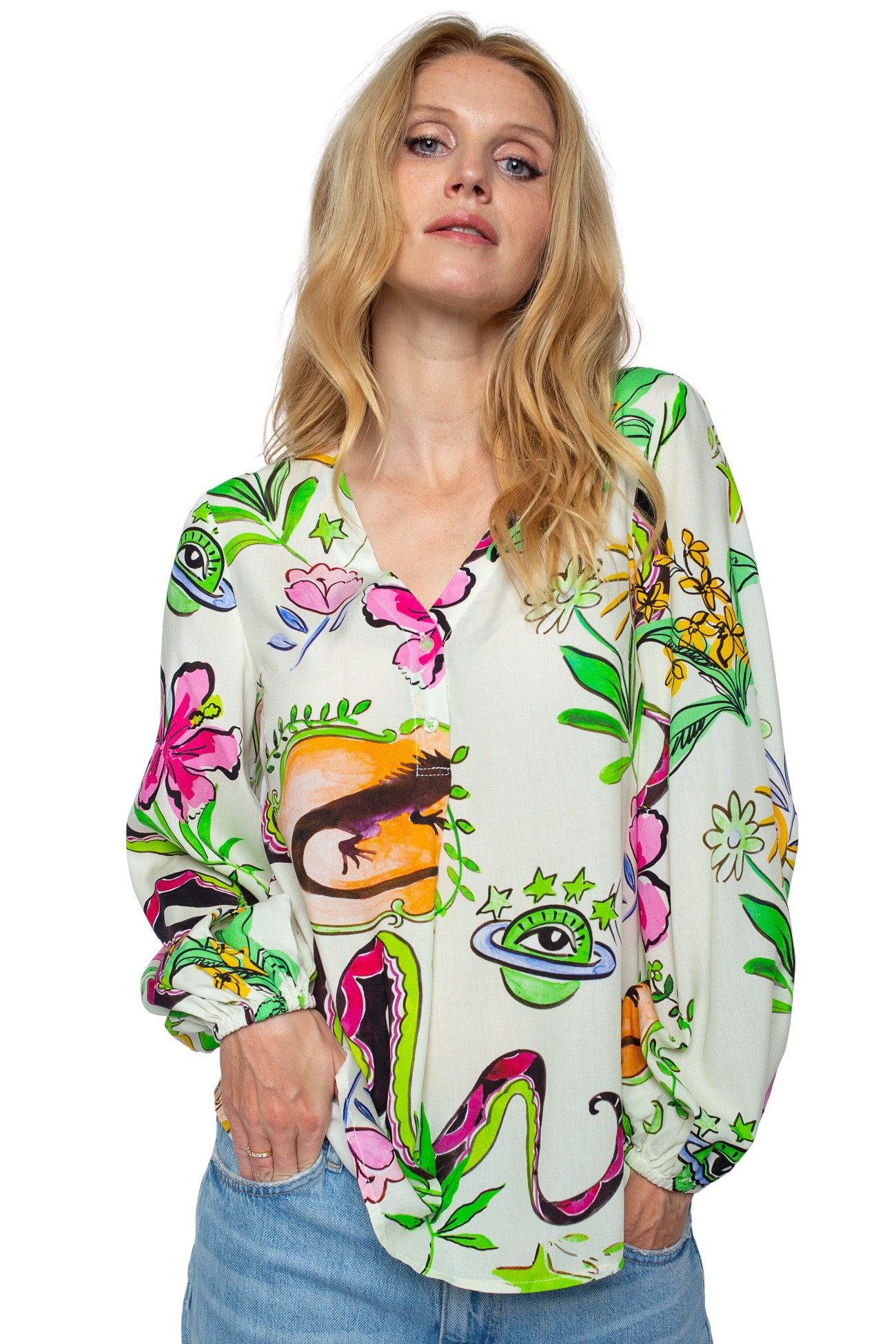 Der feminine V-Ausschnitt und die kleine Knopfleiste sorgen für einen charmanten Akzent, während die 1/1 Ärmel mit elastischem Ärmelsaum eine bequeme Passform bieten. Kurze Seitennahtschlitze verleihen der Bluse eine lässige Note und sorgen für Bewegungsfreiheit. Der lebendige Multicolour Conversational Print auf hochwertiger Viskose bringt Farbe und Freude in Ihre Garderobe. Ideal für den Alltag oder besondere Anlässe – diese Bluse kombiniert Stil und Komfort auf perfekte Weise!