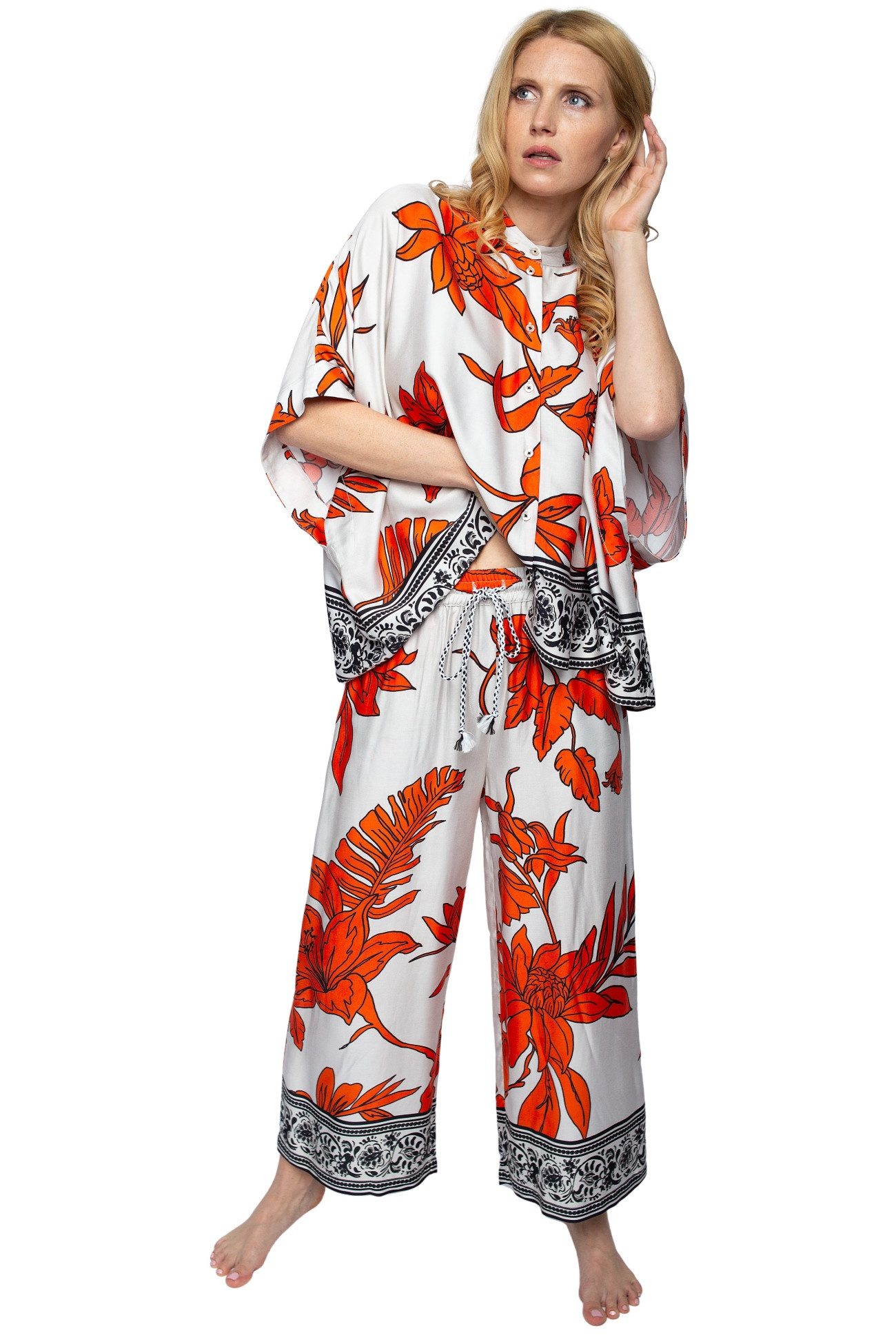 Der florale Bordüren-Print in fließendem Viskose-Satin sorgt für eine frische, lebendige Ausstrahlung und macht die Hose zu einem echten Hingucker. Diese 7/8-Длина ist ideal, um die Beine schön zur Geltung zu bringen und lässt sich wunderbar mit Sandalen oder Sneakers kombinieren. Perfekt für entspannte Sommertage, Ausflüge oder sogar für den Büroalltag!