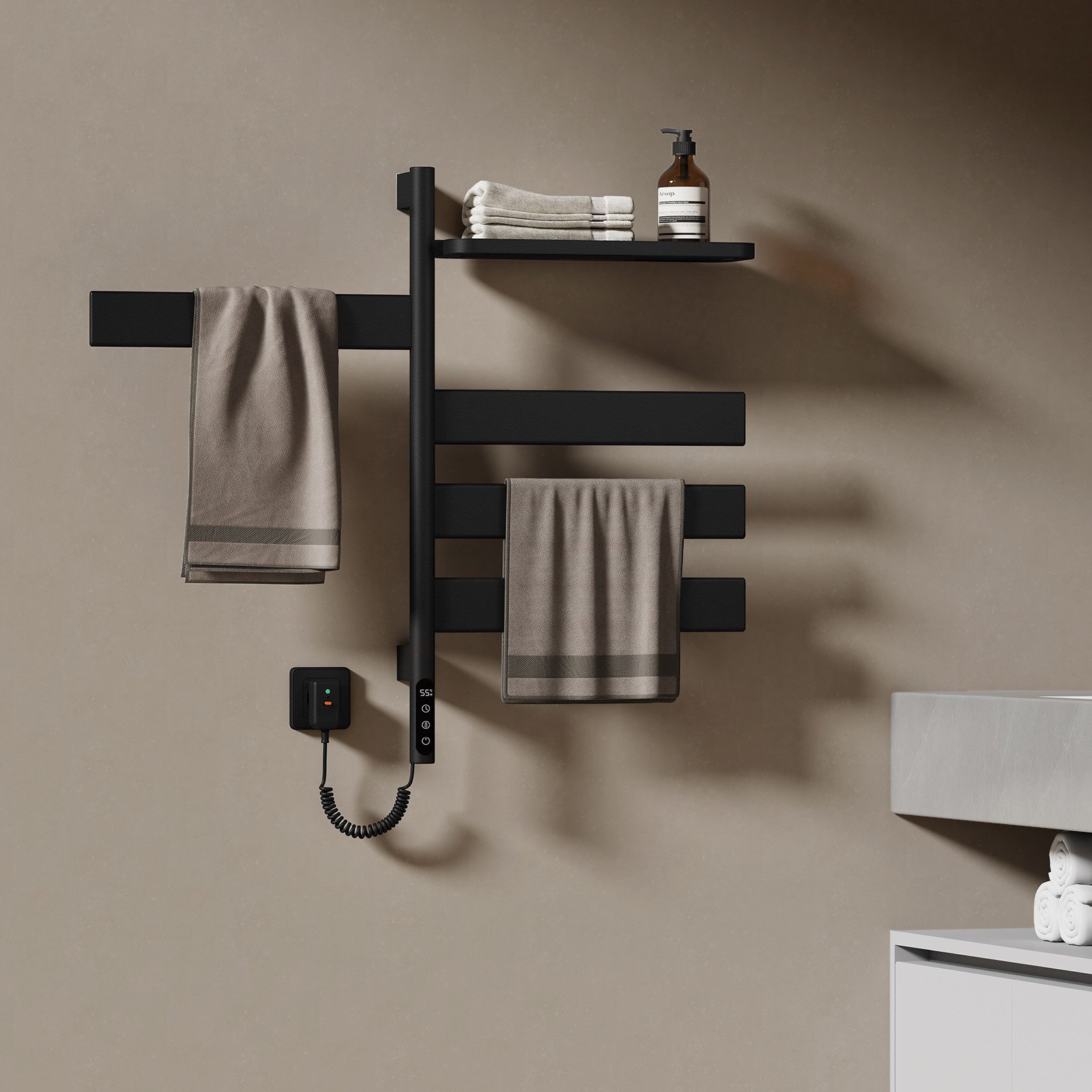 Dieses vielseitige Gerät vereint Handtuchhalter, Heizkörper und Ablage in einem eleganten Design. Ob für das schnelle Trocknen Ihrer Handtücher oder als zusätzlicher Stauraum – dieser Handtuchwärmer bietet die perfekte Symbiose aus Stil, Funktionalität und modernster Technologie.
