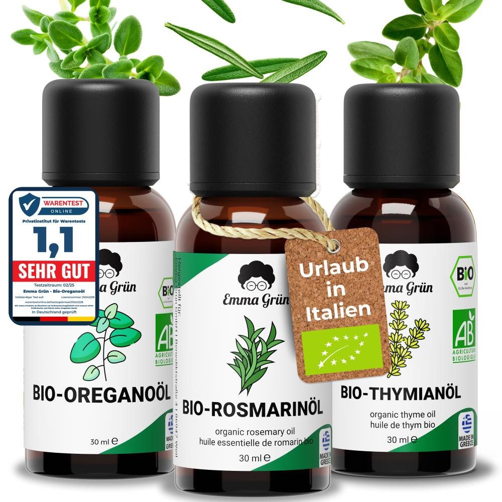 Hol dir den Geschmack Italiens direkt in deine Küche! Das "Urlaub in Italien Set" von Emma Grün vereint unser Bio-Thymianöl, Bio-Rosmarinöl und Bio-Oreganoöl. Drei ätherische Öle in Lebensmittelqualität, die dir das mediterrane Lebensgefühl nach Hause bringen – wie ein kleiner kulinarischer Kurzurlaub.