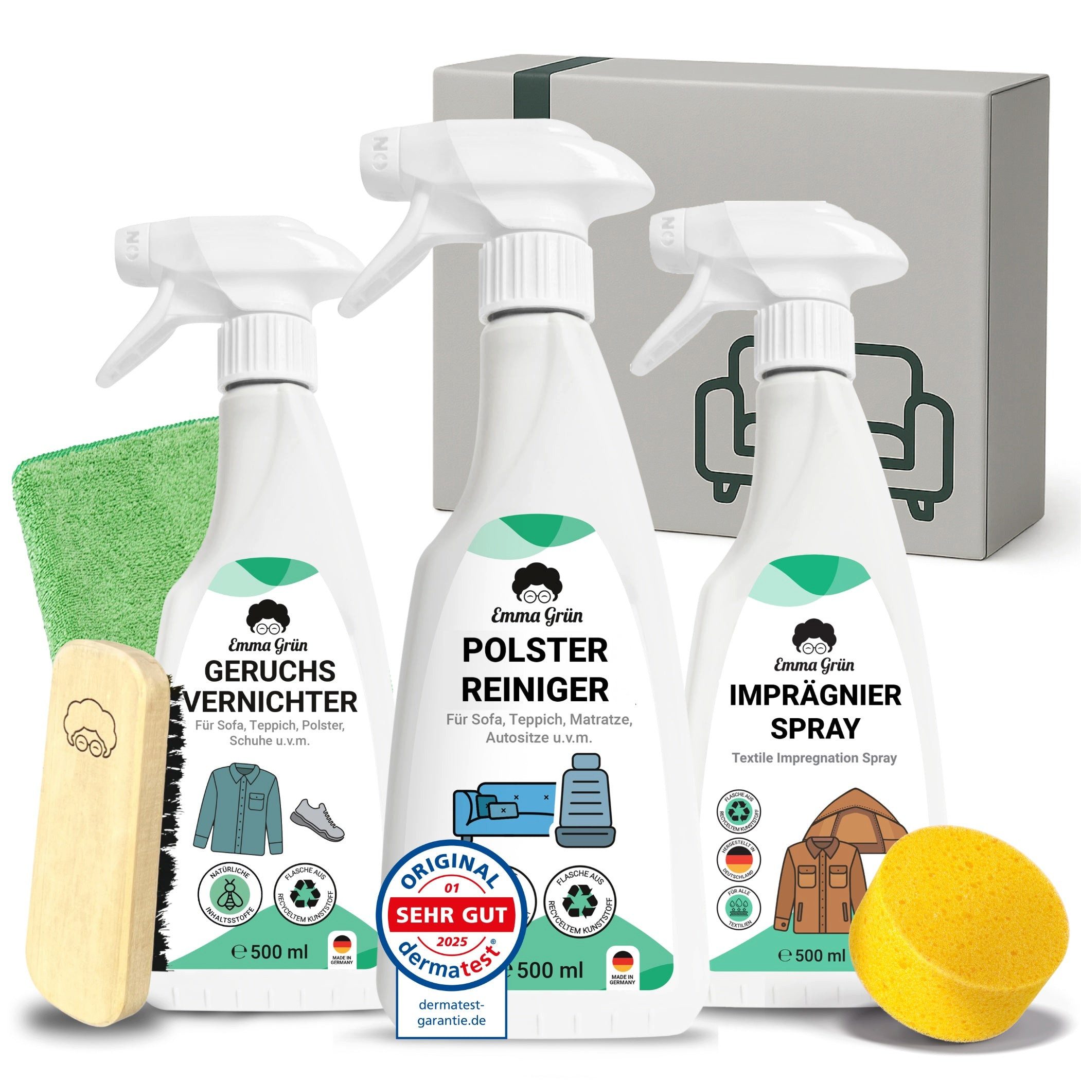 Du möchtest deine Polstermöbel nicht nur reinigen, sondern auch nachhaltig schützen? Das Emma Grün Polstermöbel Reinigungsset ist dein natürlicher Kompletthelfer! Es vereint einen tiefenwirksamen Reiniger, einen effektiven Geruchsvernichter und eine schützende Textilimprägnierung in einem Set – ergänzt durch praktische Helfer wie Bürste, Schwamm und Mikrofasertuch.