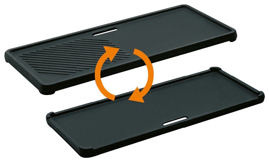 So wird der Grill zur Außenküche! Mit der Enders Guss-Wendeplatte zaubern Sie ganze Menüs auf den Teller. Die optimale Hitzeverteilung des Gusseisens sorgt für beste Ergebnisse – Spiegeleier, Zucchini- und Auberginenscheiben oder Fischfilets und Garnelen, aber auch Fleisch gelingen auf den Punkt. Die glatte Seite eignet sich für Fisch oder Geflügel, mit der geriffelten Seite verpassen Sie dem Fleisch ein erstklassiges Branding.