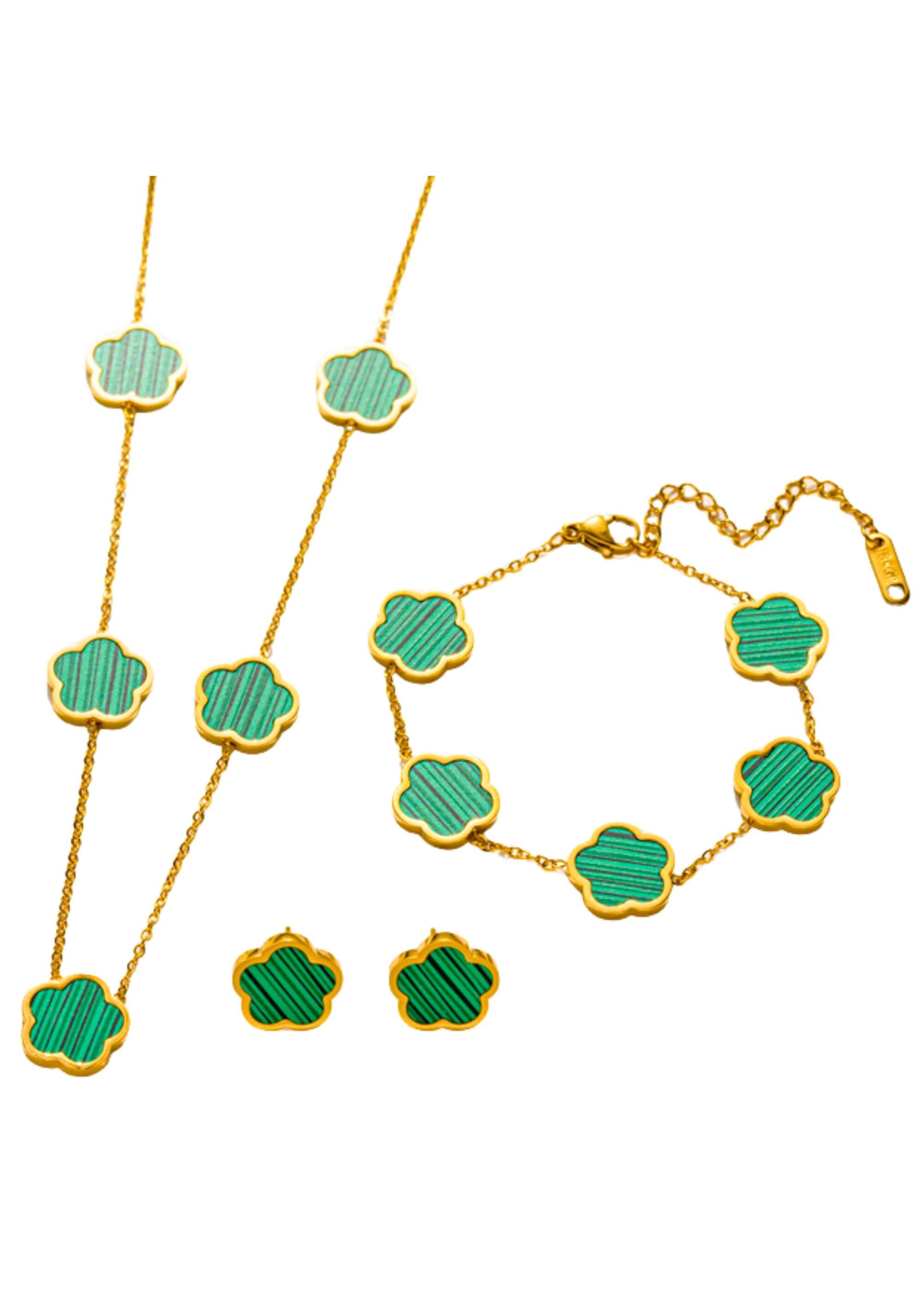 Dieses elegante Schmuck-Set überzeugt durch seine harmonische Zusammenstellung, das stilvolle Design und seine hochwertige Verarbeitung. Es besteht aus einer Halskette, einem Armband und einem Paar Ohrstecker – alle verziert mit detailreich gestalteten, vierblättrigen Blütenelementen in sattem Grün. Die feinen Maserungen und die goldene Fassung verleihen jedem Stück eine edle Ausstrahlung, die sowohl im Alltag als auch zu besonderen Anlässen für stilvolle Akzente sorgt. Sowohl Kette als auch Armband verfügen über eine praktische Verlängerungskette, die eine flexible Anpassung an jede Tragelänge ermöglicht. Das Armband schmiegt sich angenehm an jedes Handgelenk, während die zarte Halskette das Dekolleté elegant betont. Die Ohrstecker runden das Ensemble perfekt ab und sorgen für ein stimmiges Gesamtbild. Das hochwertige Material mit vergoldeter Oberfläche ist resistent gegen Abnutzung und behält seinen edlen Glanz über viele Jahre hinweg. Ob einzeln getragen oder als abgestimmtes Set kombiniert – dieses Schmuck-Ensemble bietet vielfältige Styling-Möglichkeiten und verleiht jedem Outfit eine feminine, moderne Note. Dank der exzellenten Verarbeitung und dem zeitlos eleganten Design ist dieses Schmuck-Set auch hervorragend als Geschenk geeignet – sei es für einen geliebten Menschen oder für sich selbst. Es bietet ein überzeugendes Preis-Leistungs-Verhältnis und ist ein echtes Highlight in jeder Schmucksammlung. Tragen Sie es selbst oder verschenken Sie es – dieses Set wird garantiert für bewundernde Blicke sorgen.