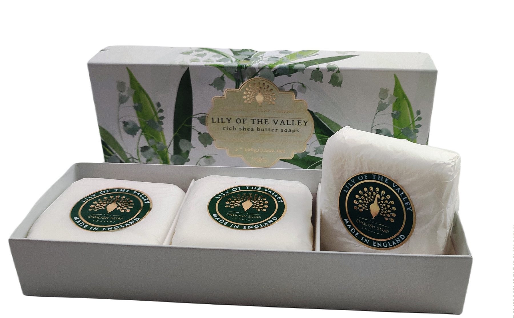 Verschenken Sie den Duft von exquisiter Frische mit der Lilien-des-Tals Dreierseifen-Geschenkbox. Dieses Geschenkset enthält drei einzeln verpackte Seifenstücke zu je 100g, perfekt präsentiert in einer Geschenkbox mit typisch englischen Garten-Illustrationen.