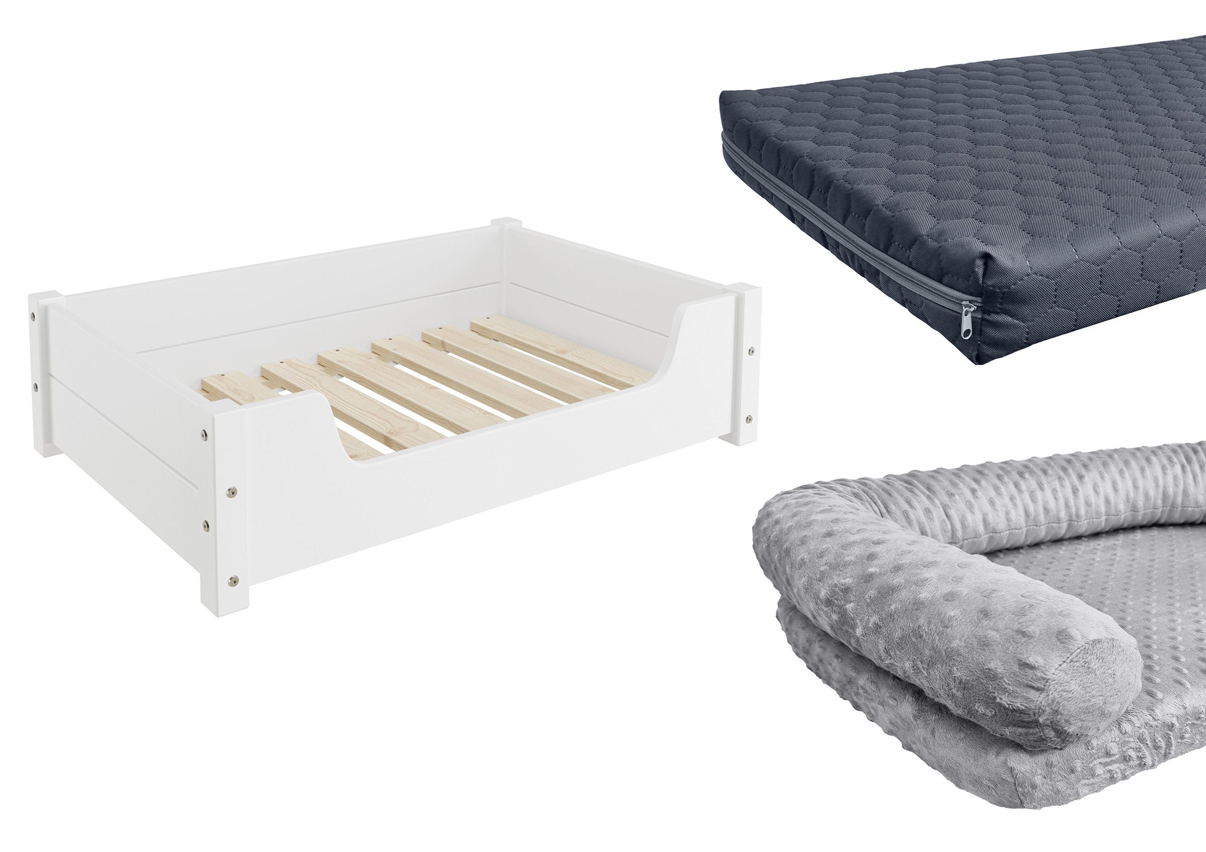 Holzkörbchen, Rollrost, Matratze mit Bezug, graue Kissenrolle und flauschiges Spannlaken grau für Matratze