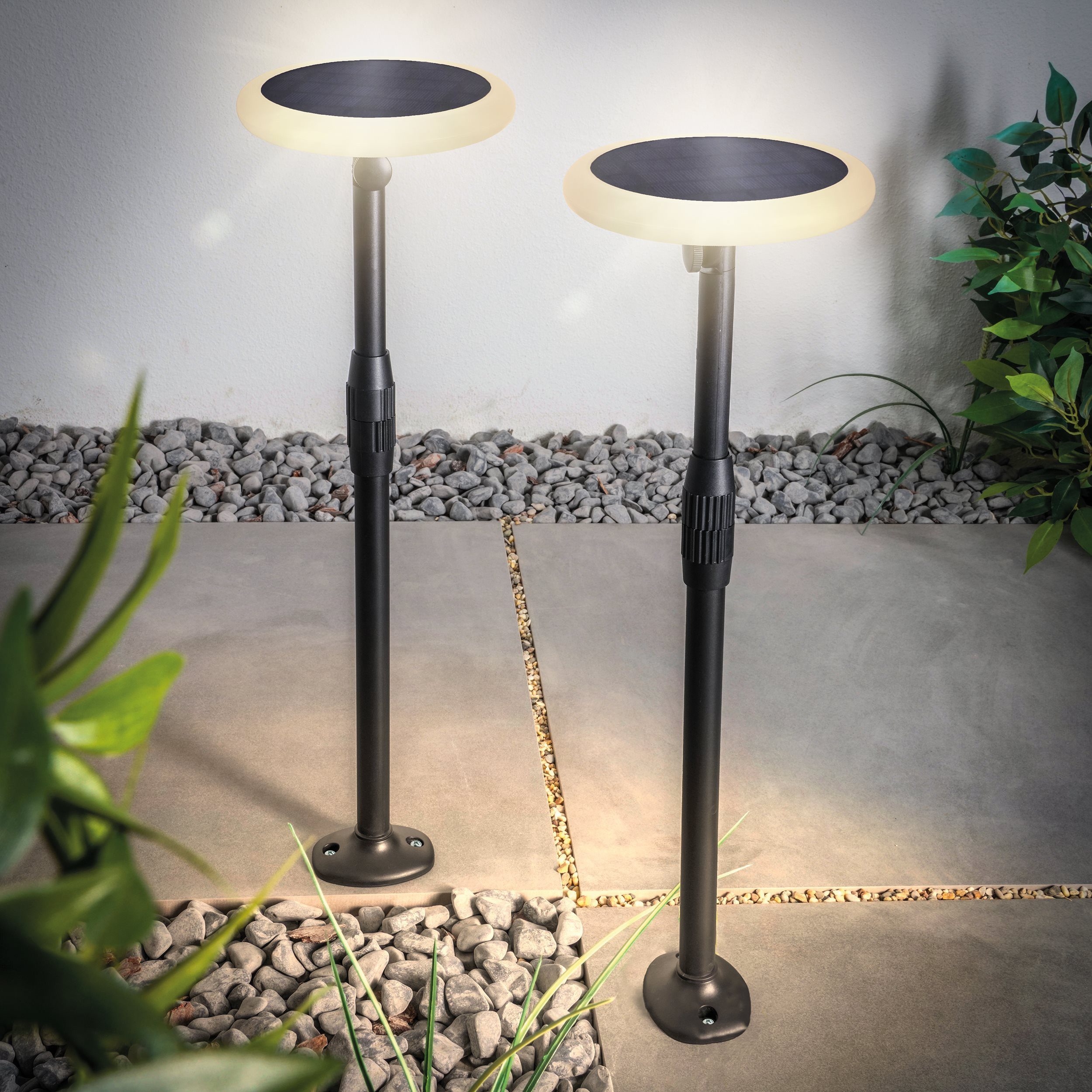 Diese beiden Solar-Leuchten passen sich voll und ganz den Gegebenheiten an, die sie bei Ihnen erwarten: Sie lassen sich über ihr Teleskopbein flexibel von 42 cm auf circa 70 cm erhöhen, darüber hinaus können ihre runden Lampenschirme seitlich gekippt werden, sodass die auf dem Schirm verbauten Solarmodule immer genau nach dem Stand der Sonne ausgerichtet werden können. Natürlich profitiert auch die Beleuchtung Ihres Außenbereichs durch die Lichtringe aus 43 warmweißen SMD-LEDs von der Flexibilität der Steckleuchten, indem sie bei Nacht dorthin ausgerichtet werden können, wo gerade konkret Licht benötigt wird.