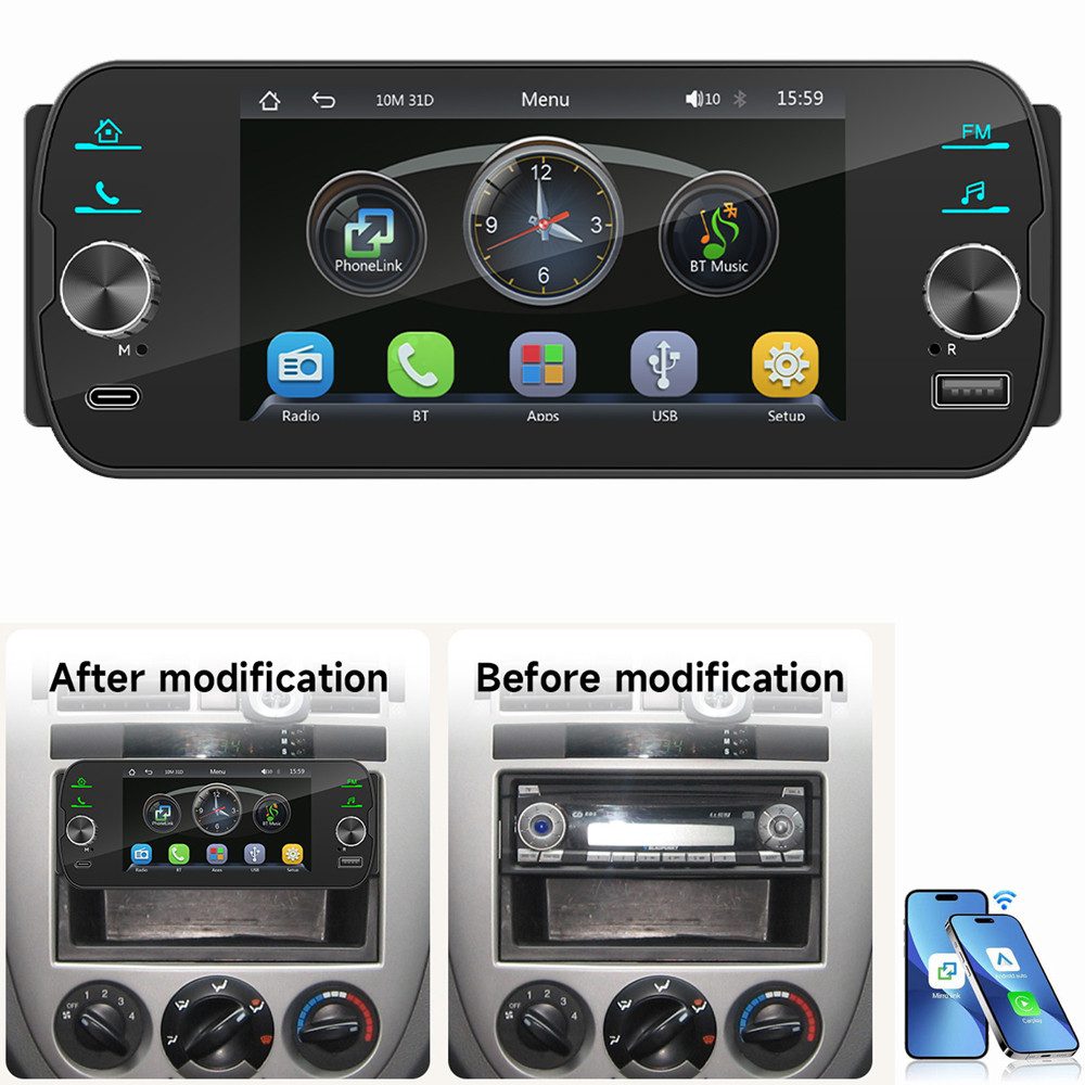 Fahrzeugpassung und Multifunktionen Standardgröße, universelle Stromversorgung, Audiostecker, umfangreiche Funktionserweiterungsanschlüsse. Unser Single-DIN-Autoradio kann die Anforderungen der meisten Fahrzeuge erfüllen. Bitte bestätigen Sie vor der Bestellung, dass die Размер Ihrer Armaturenbrettöffnung geeignet ist. Zusätzliche Funktionen: USB/Typ-C, AM/FM-Radio, Audio-/Video-Ausgang, Videoeingang für Front- und Rückfahrkamera. Arbeitsspannung: DC 12 V, maximale Ausgangsleistung: 4 x 60W.