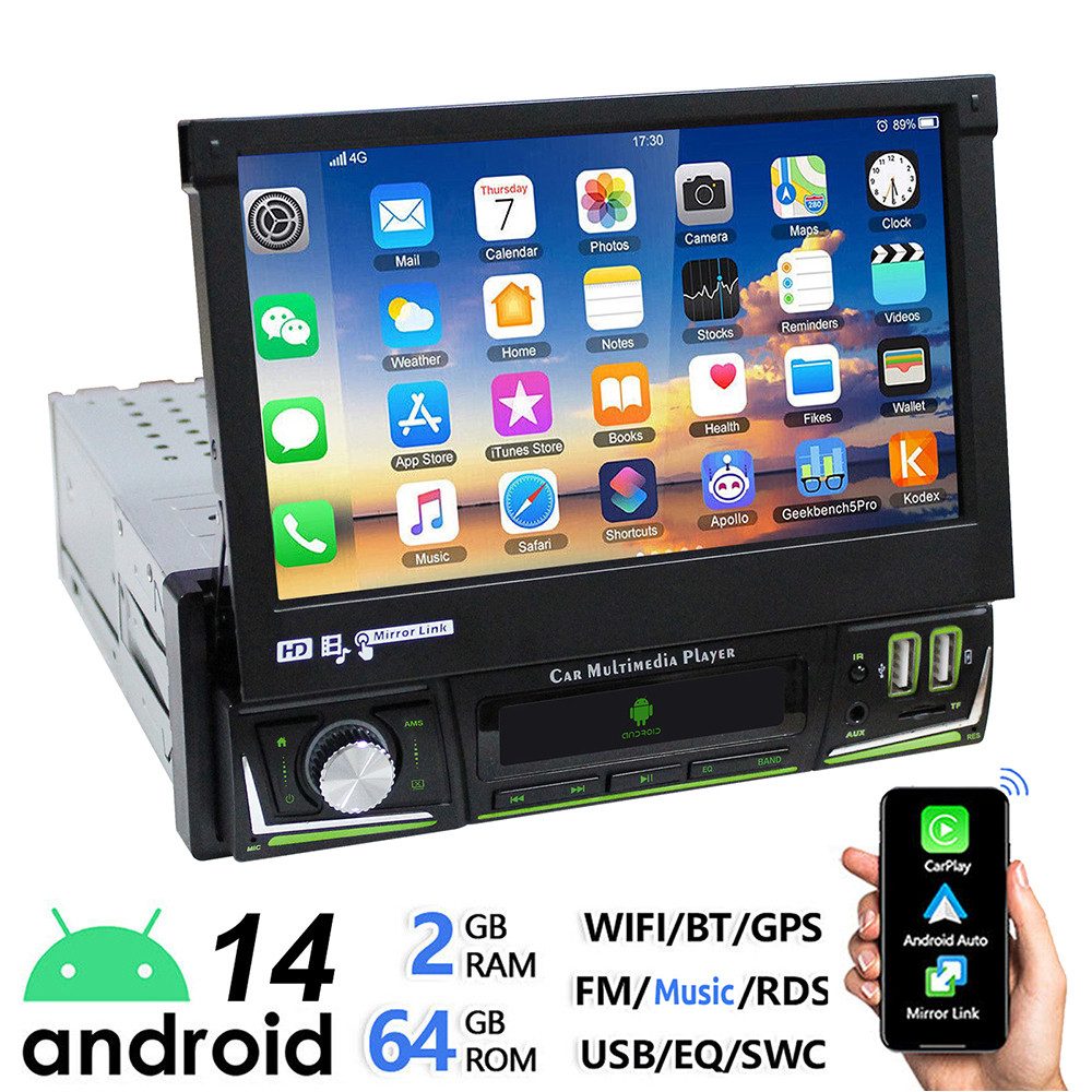 7 Zoll 1 DIN Android 14 Autoradio – Einbaumaß: 174*171*50 mm/6.85*6.73*2.0 in. Der 7-Zoll-HD-Handausziehbildschirm bietet Ihnen ein besseres visuelles Erlebnis und bringt ein besseres Technikgefühl in Ihr Auto! Ausgestattet mit einem hochauflösenden kapazitiven Touchscreen und leicht erreichbaren physischen Tasten, USB-, TF- und AUX-Anschluss, um mehrere Optionen für Musik- und Filmgenuss im Fahrzeug zu bieten. Mit dem leistungsstarken Android 14-System können Sie das reibungslose und reaktionsschnelle Autoradio genießen.