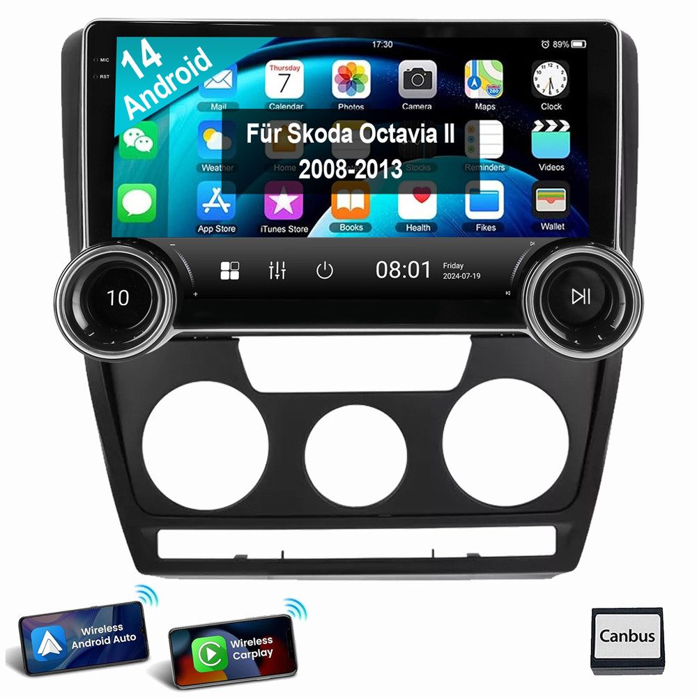 10 Zoll Android 14 Autoradio Für Skoda Octavia 2 II 2008-2013:Das Android Autoradio mit 10" 1280* 720 IPS kapazitivem Touchscreen, 2/4GB RAM und 32/64GB ROM ermöglicht das Herunterladen Ihrer Lieblings-Apps und -Videos, damit das Autofahren nicht mehr langweilig wird. Kein zusätzlicher Rahmen, kein Kabelwechsel, Plug and Play. Es wird mit Canbus geliefert und unterstützt die meisten Originalfunktionen: Lenkradsteuerung, Rückwärtssignale und Lesen von Original-Computerdaten usw.