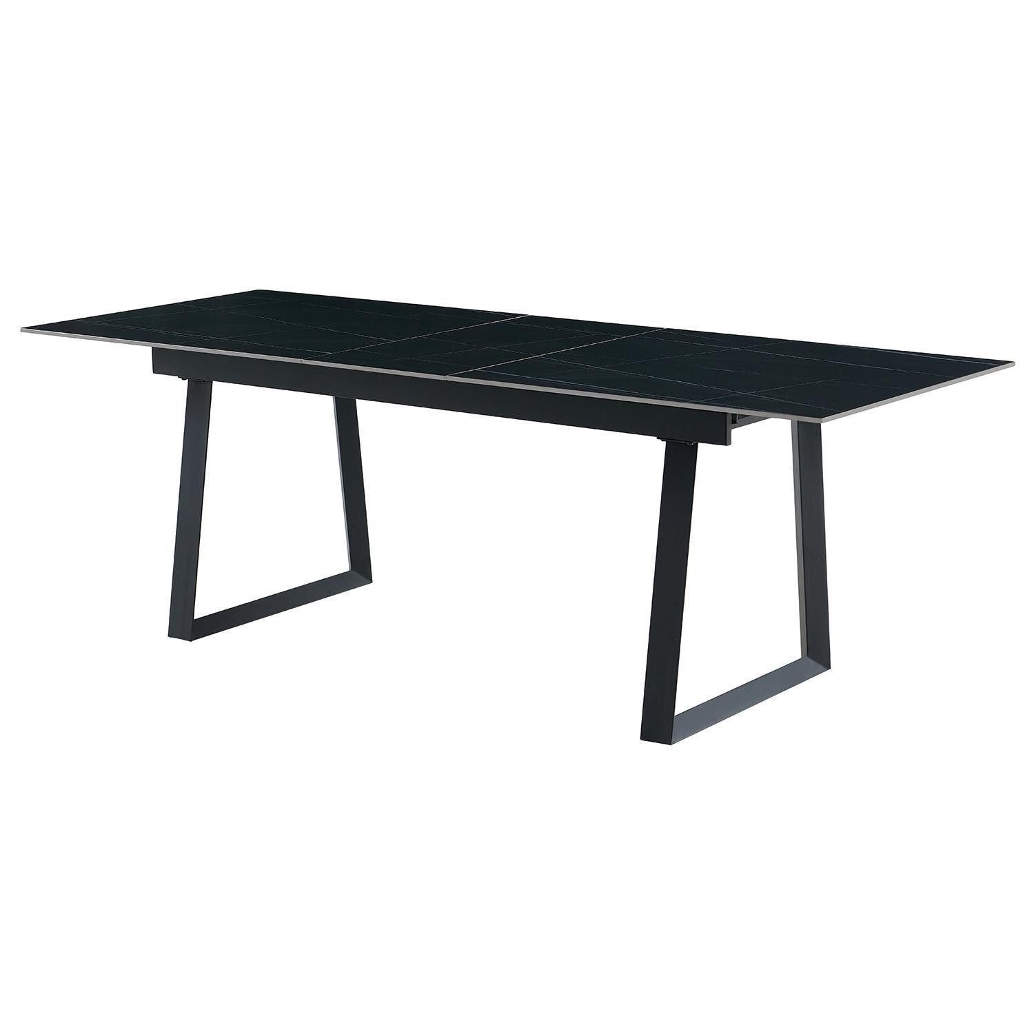 Der Esstisch RIO ist mit einer Tischplatte aus gesintertem Stein in Schwarz ausgestattet und steht auf einem Metallgestell in gleicher Farbgebung. Über den Mittelauszug mit einem Einlegeboden und Liftautomatik lässt sich die Tischbreite von 180 cm auf bis zu 220 cm erweitern. Die Tiefe beträgt 90 cm.