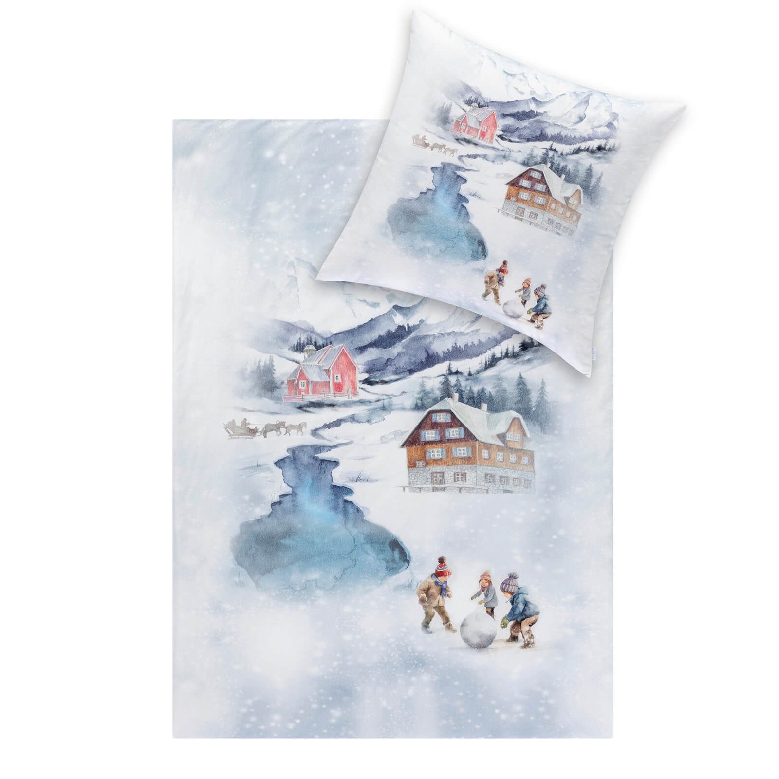 Tauchen Sie ein in eine winterliche Traumwelt mit dieser herrlich weichen Bettwäsche aus 100 Prozent Baumwolle in Kuschelflanell von Estella. Das malerische Motiv zeigt eine idyllische Schneelandschaft mit verschneiten Bergen, Gebirgssee, gemütlichen Berghäusern und fröhlich spielenden Kindern beim Schneeballrollen. Die harmonische Winterkulisse verbreitet sofort eine heimelige Stimmung und bringt die Magie verschneiter Tage direkt in Ihr Schlafzimmer. Dank der flauschig weichen und wärmenden Flanell Oberfläche ist die Garnitur ideal für den Winter geeignet und sorgt auch in kalten Nächten für allerbesten Schlafkomfort.