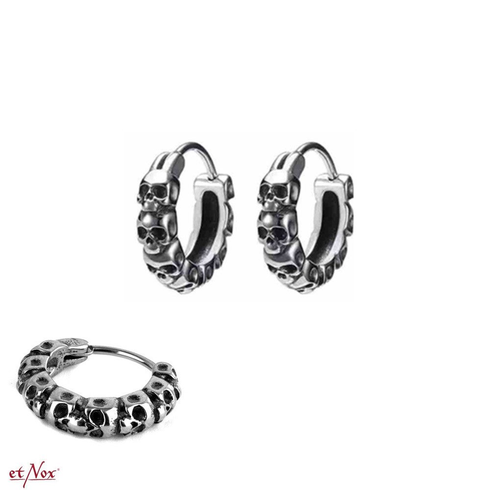 Stylische Creolen mit Totenköpfen. Die runden Ohrringe sind aus hautfreundlichem Edelstahl gefertigt und mit einem praktischen Klickverschluss ausgestattet.