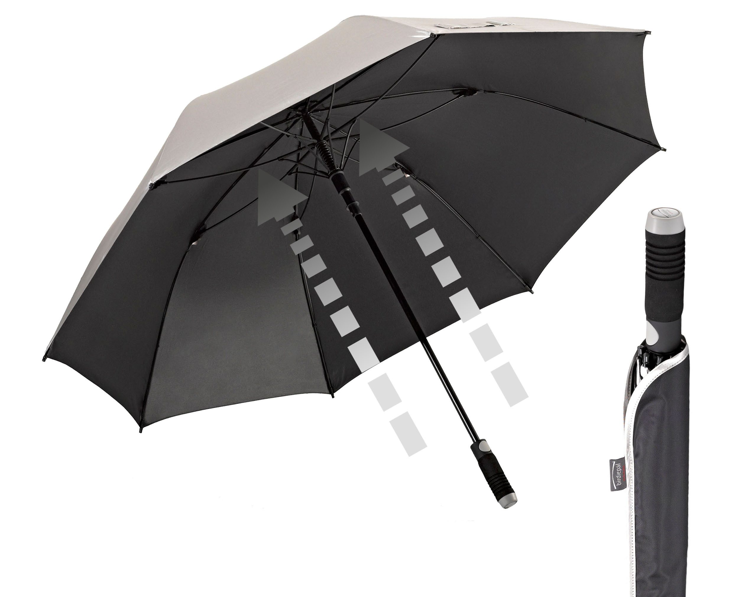 Der Stockregenschirm »birdiepal automatic, silber, UV-Schutz 50+« von EuroSCHIRM® bietet dank seiner XXL-Размер gleich Platz für zwei Personen. Dank des robusten Schafts und der hochflexiblen Streben aus Glasfasern punktet er darüber hinaus mit einer besonderen Stabilität. So kann ihm Wind nichts anhaben und er kann auch an stürmischen Tagen eingesetzt werden. Zudem lässt sich der hochwertige XXL-Regenschirm bequem automatisch öffnen und schnell manuell wieder schließen. Auch die praktische Schutzhülle ist bereits im Lieferumfang mit inbegriffen. Fürs Golfspielen, den gemeinsamen Weg ins Restaurant oder auch Spaziergänge zu Zweit: der EuroSCHIRM® Regenschirm »birdiepal automatic, silber, UV-Schutz 50+« in XXL-Größe.