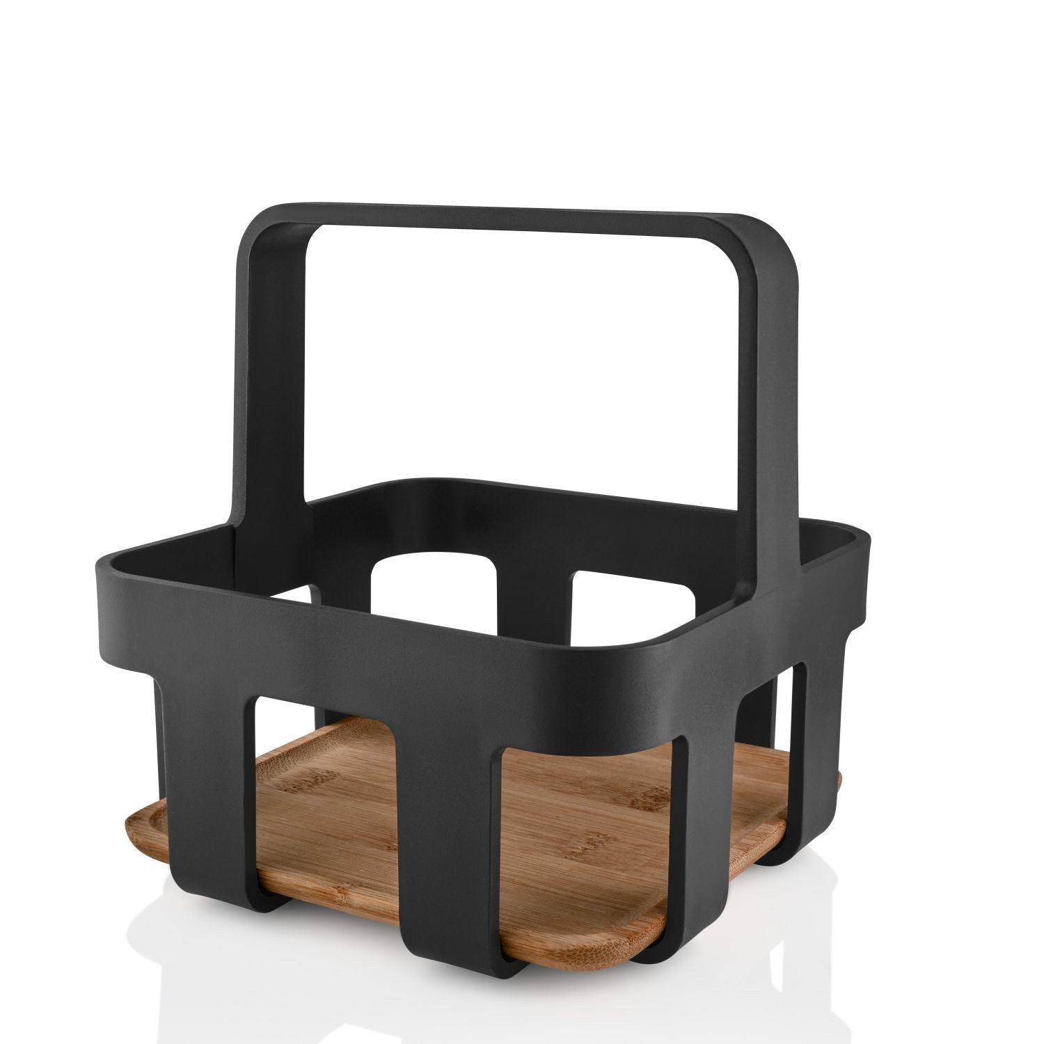 Die Nordic Kitchen Tisch-Caddy-Aufbewahrung von Eva Solo ist eine zeitlose Serviermöglichkeit, die besonders praktisch und vielseitig einsetzbar ist. Der Korb aus Bambusholz und Kunststoff eignet mit seinem praktischen Tragegriff beispielsweise zum Transportieren von Grillsaucen, Öl oder Salz- und Pfeffermühle auf Grillpartys oder auch Picknicks. Der Caddy kann aber genauso gut in der Küche auf der Arbeitsfläche oder dem Esstisch für Gewürze, Dressings und Saucen genutzt werden und ergänzt die weiteren Produkte der Nordic Kitchen Serie ideal. Der funktionale und praktische Korb, der in einem schlichten, zeitlosen Design gehalten wurde, passt sich in die allermeisten Umgebungen perfekt ein. Das Bambusholz und der matte, schwarze Kunststoff lassen sich besonders leicht reinigen, indem man es einfach mit einem Tuch abwischt. Das Bambusholz kann darüber hinaus durch regelmäßiges Ölen gepflegt werden. Der Caddy hat ein Seitenmaß von 17 cm und ist 18,5 cm hoch.