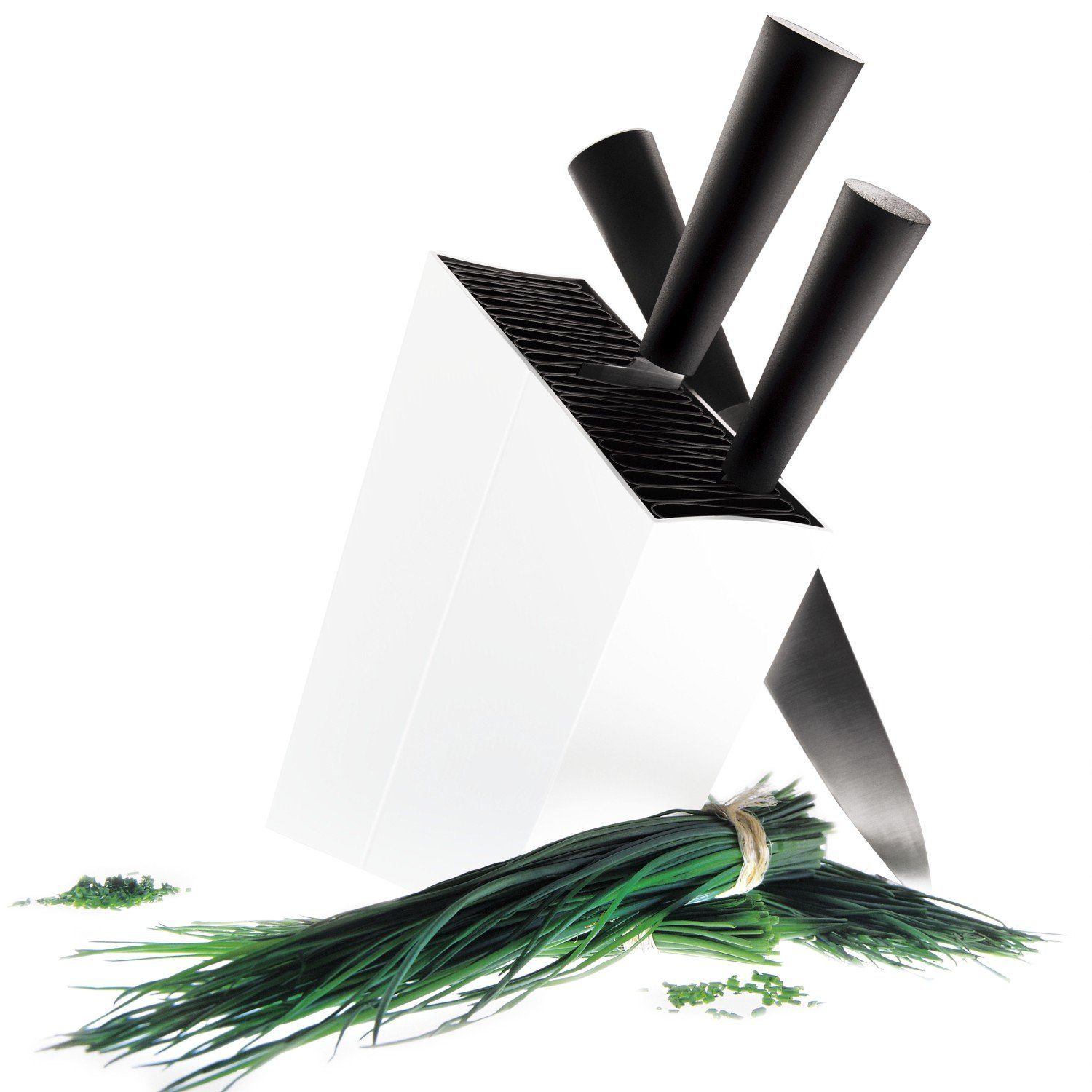 Der Messerblock Schräg Weiß von Eva Solo ist für alle Arten von Messern und viele andere Küchenhelfer geeignet. Das Aluminiumgehäuse bietet Platz für die lamellenförmigen Kunststoffeinsätze, die zur Reinigung in der Spülmaschine entnehmbar sind.