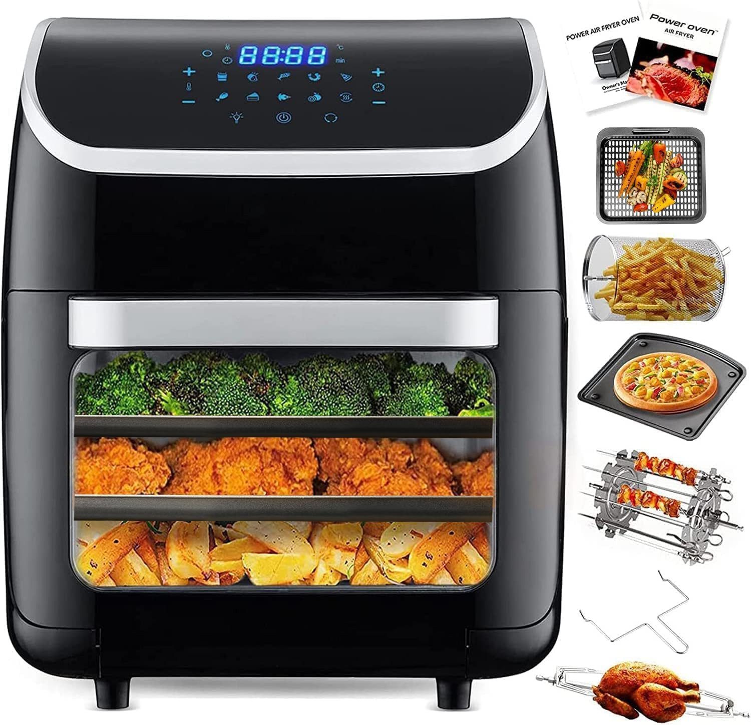 Top-Features | Die 12L Heißluftfritteuse: Großes Fassungsvermögen, 1800W, 10 Programme, Touchdisplay, Drehgrill + Zubehör für gesundes, effizientes Garen. |