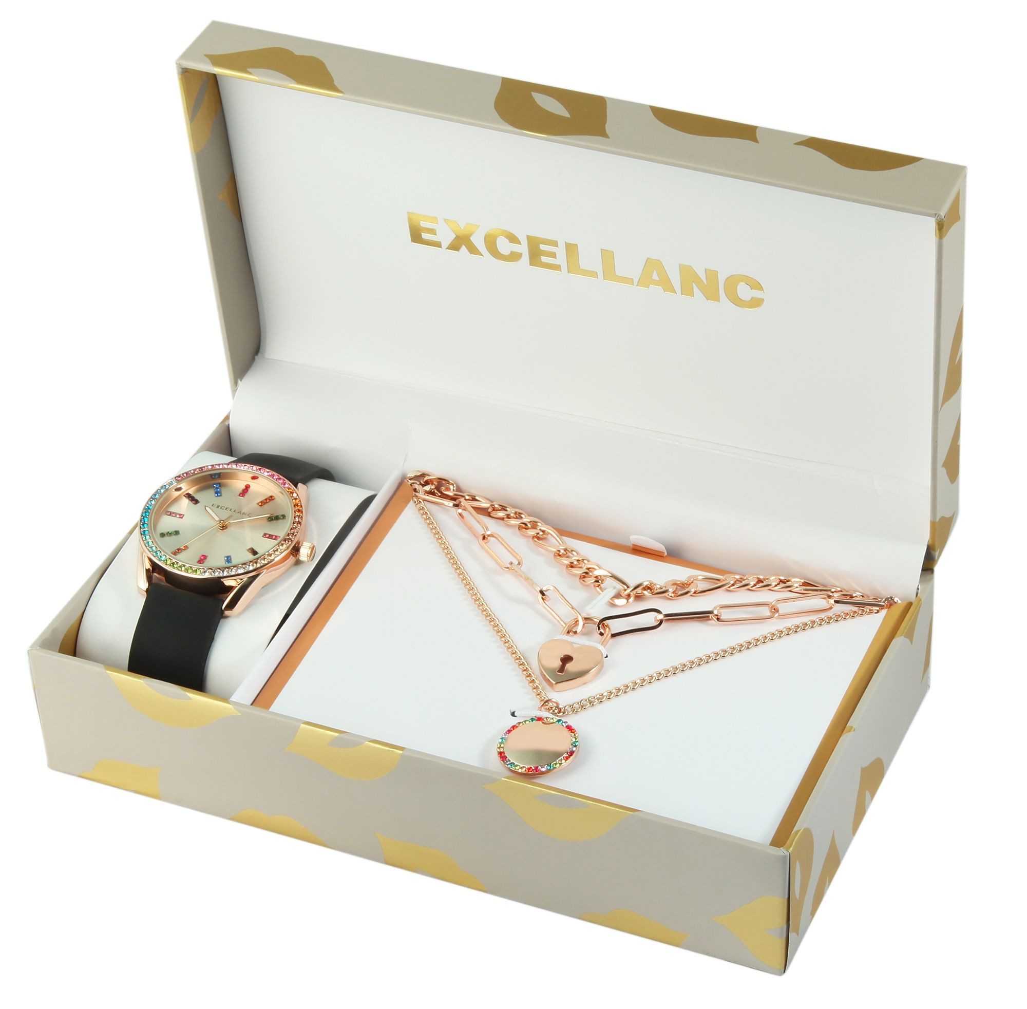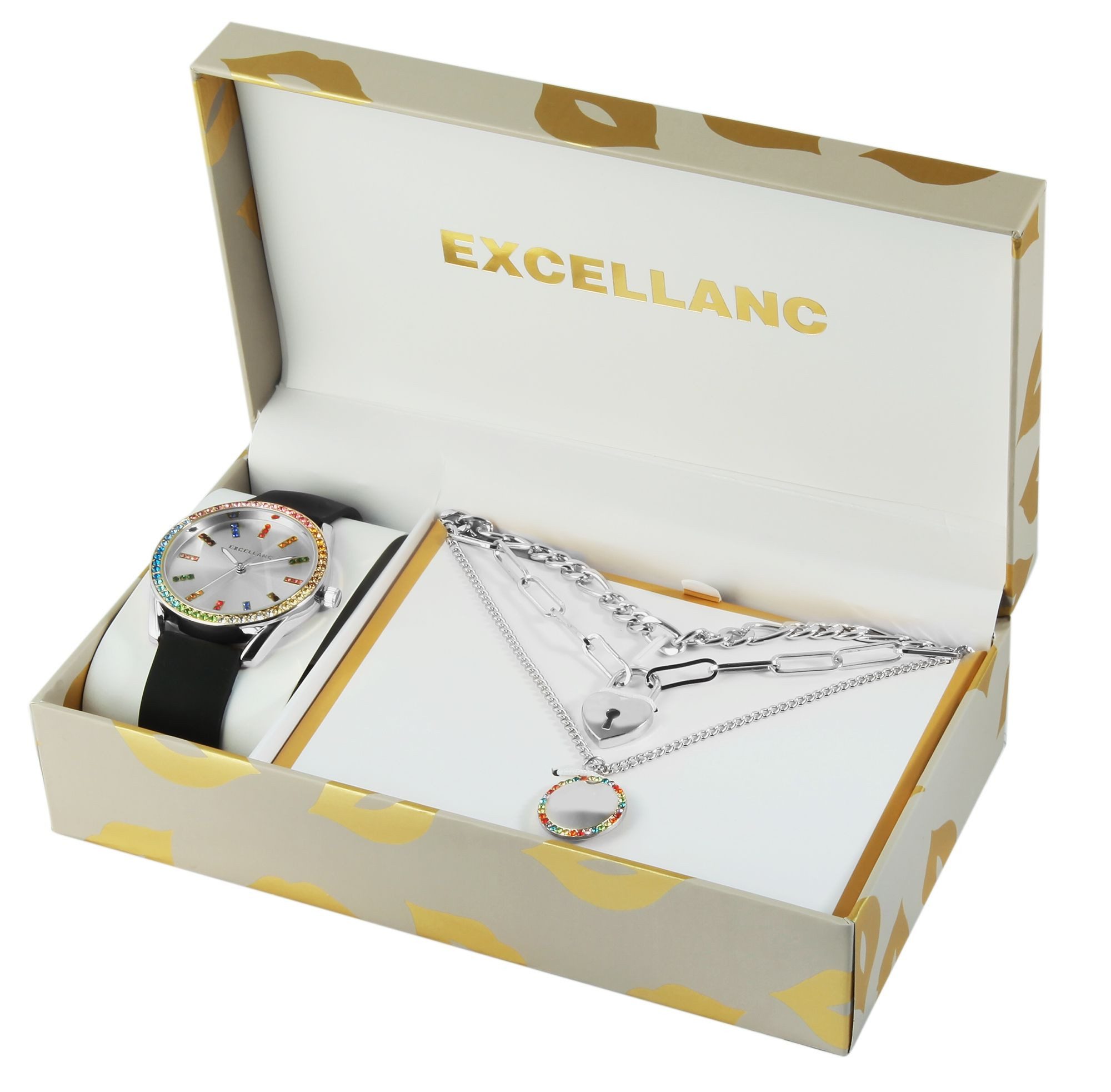 Das Geschenkset der Marke Excellanc besteht aus einer Damenarmbanduhr und drei Halsketten. Die Schmuckstücke lassen sich ideal in Kombination tragen, beispielsweise im angesagten Layering-Look, da sie zusammen eine harmonische Einheit ergeben. Die analoge 3-Zeiger Damenarmbanduhr verfügt über ein hochwertiges und ganggenaues Quarzuhrwerk. Das weiche Silikonarmband ist am Anstoß 18 mm breit und lässt sich mit einer Dornschließe öffnen und schließen. Das Band sorgt für höchsten Tragekomfort, schmiegt sich angenehm dem Handgelenk an und ist besonders unempfindlich. Die Gesamtlänge der Uhr beträgt 24 cm. Das Metallgehäuse mit Mineralglas hat eine Abmessung von 38 mm im Durchmesser und einer Gehäusehöhe von 8 mm. Hingucker bei dieser Uhr sind die bunten Similisteine, die sich rund um die Lünette zieren. Auch im Zifferblatt präsentieren sich funkelnde Similisteine in Baguetteform, die als Strichindexe auf jeder vollen Stunde dienen. Das aufgeräumte Zifferblatt mit Strichindexeinteilung ermöglicht ein schnelles und einfaches Ablesen der aktuellen Uhrzeit. Dank der mit Superluminova beschichteten Zeiger ist dies auch im Dunkeln möglich. Zusätzlich beinhaltet das Set eine 47 cm lange Figarohalskette, eine 50 cm lange Ankerkette mit rundem Anhänger und buntem Similibesatz und eine 40 cm lange Schmuckkette, die mittig von einem Herzschloss-Anhänger unterbrochen wird. Все Ketten lassen sich mit einem klassischen Karabinerhaken öffnen und schließen und lassen sich aufgrund von Verlängerungskettchen in der Длина individuell variieren. Rundum ist das Damenset ein toller Blickfang und eignet sich fantastisch als Geschenk, da jedes Set in einer hochwertigen Box verschickt wird. Mit diesen beeindruckenden Schmuckstücken lenken Sie geschickt alle Blicke auf sich und Ihre modischen Accessoires.