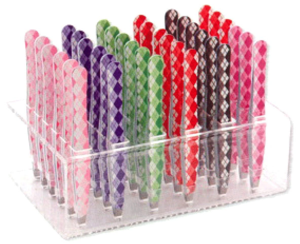 Pinzetten Display 24 Stück. Praktisches Display mit 24 bunten Pinzetten in schönem Design. Ein echter Hingucker in jedem Laden. Все Pinzetten besitzen eine schräge Form vorne. Das Pinzetten-Display eignet sich besonders zur Ausstellung für Apotheken oder Wiederverkäufer. Somit können Sie individuell für Ihre Kunden an ihrem Point of Sale (Verkaufsort) Produkte präsentieren. Die Pinzette eignet sich zum Zupfen, Stylen, Formen von Augenbrauen, Schnurrbarthaaren oder auch Gesichtshaaren. Die abgeschrägten Spitzen der Pinzette besitzen den optimalen Winkel, um direkt am Augenbrauenknochen zu arbeiten.