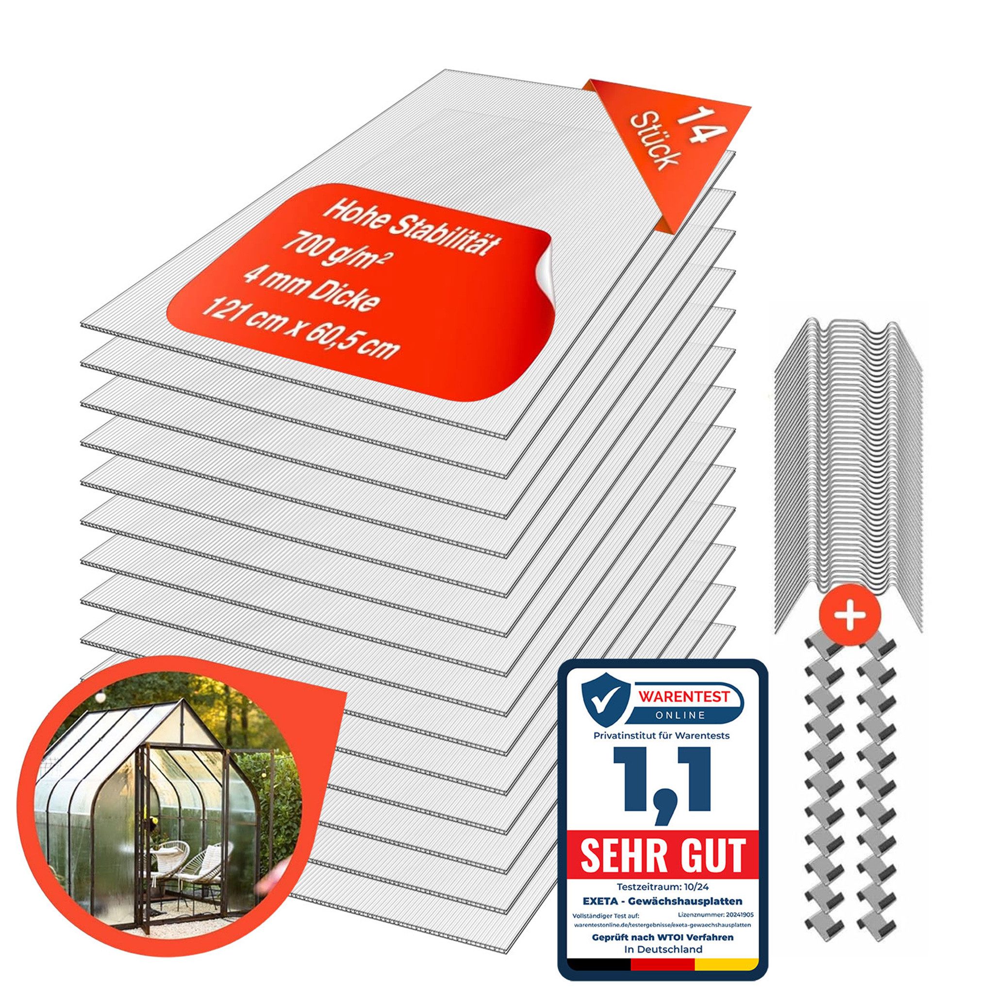 Exeta Home Gewächshausplatten 4mm 14 Stk. I Plexiglas Platten Polycarbonat Doppelstegplatten I Hohlkammerplatten 60,5 x 121cm, UV-beständig, bruchsicher, 10,25m² I Ideal für Garten, Carport & Frühbeete Hochwertige Polycarbonat-Qualität: Unser 14er Set Exeta Home Gewächshausplatten aus 4mm dickem, nicht recyceltem Polycarbonat bietet insgesamt 10,25m² Abdeckung. Ideal für eine Vielzahl von Anwendungen, von Gewächshäusern bis hin zu Carports. Langlebiger UV-Schutz: Jede Stegplatte ist mit einer Schutzfolie (bitte abziehen) überzogen und bietet eine UV-beständige Seite zur Maximierung der Lebensdauer und zum Schutz Ihrer Pflanzen und Strukturen für bis zu 10 Jahre. Vielseitige Anwendungsmöglichkeiten: Egal ob im Garten, für Überdachungen, Windschutz, Carports oder Frühbeete – unsere universell einsetzbaren Stegplatten sind die ideale Wahl für jedes Projekt. Einfache Handhabung und Bearbeitung: Die Platten können mühelos mit einem Teppichmesser zugeschnitten und durch Bohren, Sägen oder Biegen individuell angepasst werden, ohne dass die Qualität leidet. Robust und Witterungsbeständig: Mit einem Gewicht von 700g/m² sind die Exeta Home Platten bruchsicher und widerstandsfähig gegen Hagel, gewährleisten eine hohe Langlebigkeit und bieten optimalen Schutz. Die Lieferung erfolgt inklusive 50 W Klammern + 50 Z Clips.