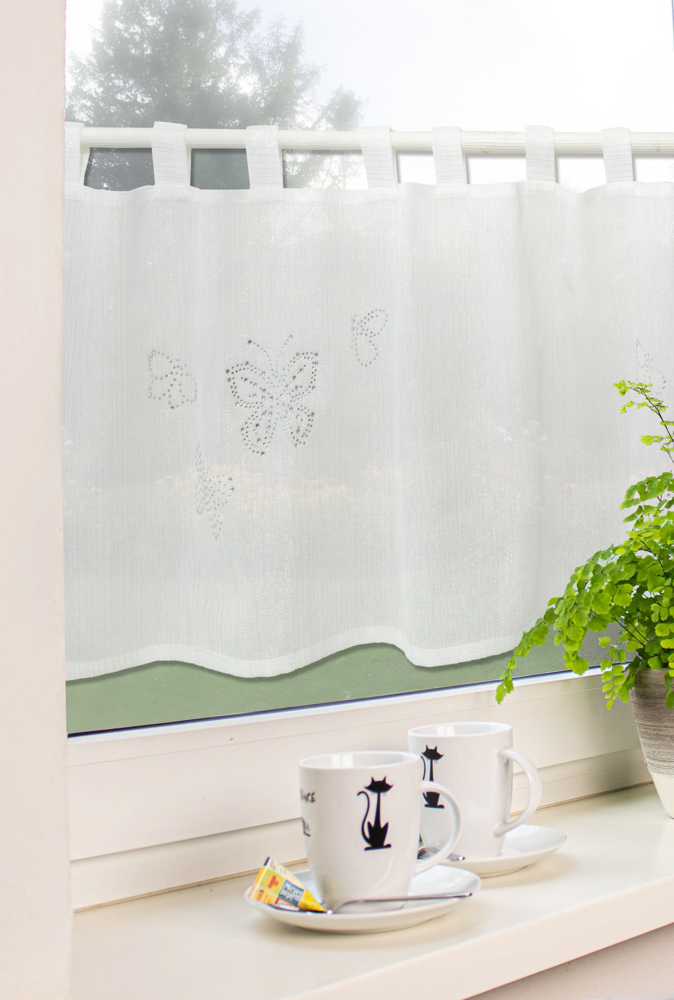 Das Design Panneaux ist ein Schmuckstück für jeden Wohnraum. Die aufgebrachten Schmetterlinge bestehen aus vielen glitzernden Steinen und der Stangendurchzug dieser Natur Scheibengardine macht das Bild komplett. Die hochwertige stickerei Bistro Gardine ist somit sofort und leicht anzubringen. Einfach auf eine dünne Stange bis 10mm Durchmesser oder Vitragenstange schieben und auf die Dekorationsbreite verteilen.