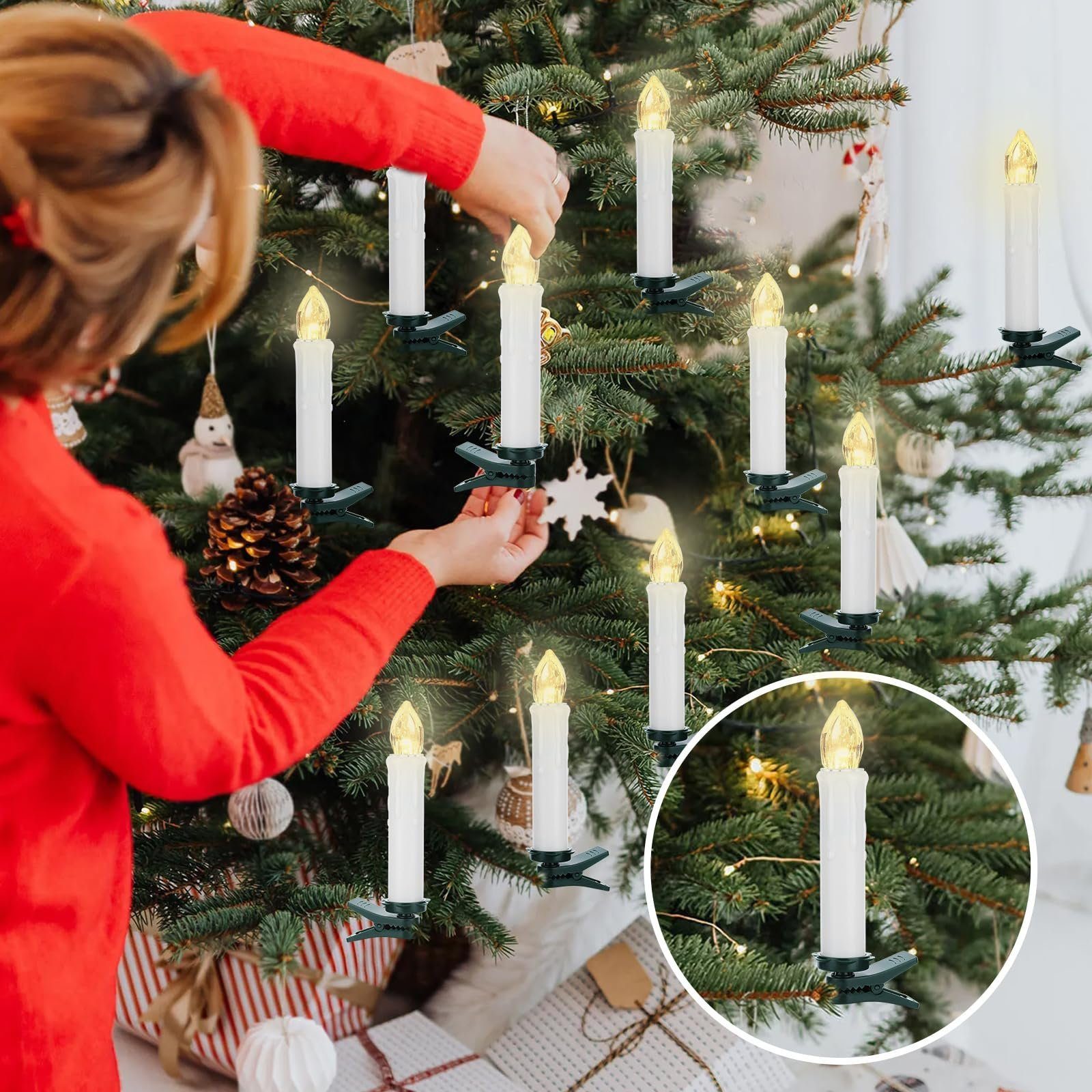Unsere LED Weihnachtskerzen sind mit praktischen Clips ausgestattet, die es Ihnen ermöglichen, die Ausrichtung der Kerzen nach Ihren Wünschen anzupassen. Man kann die Weihnachtskerzen ganz einfach an Baum und Zweigen befestigen.