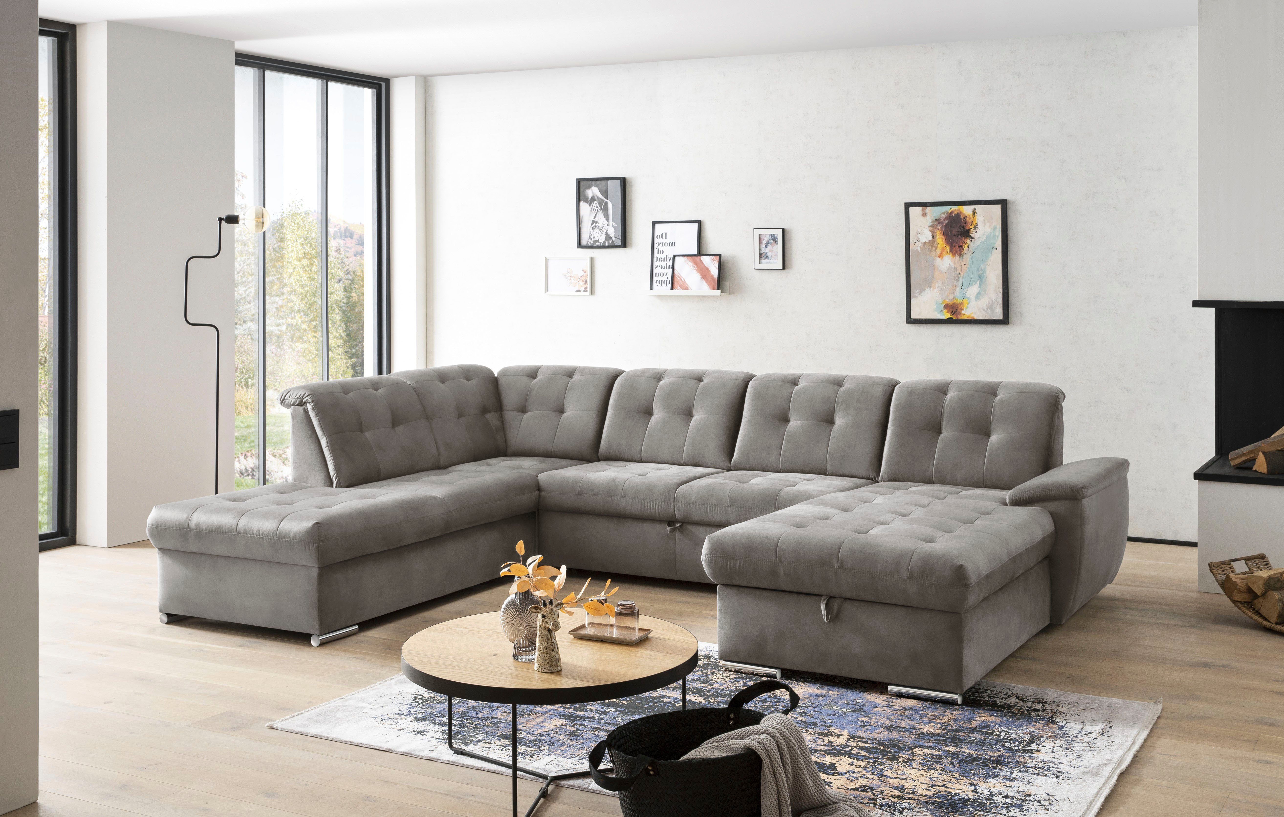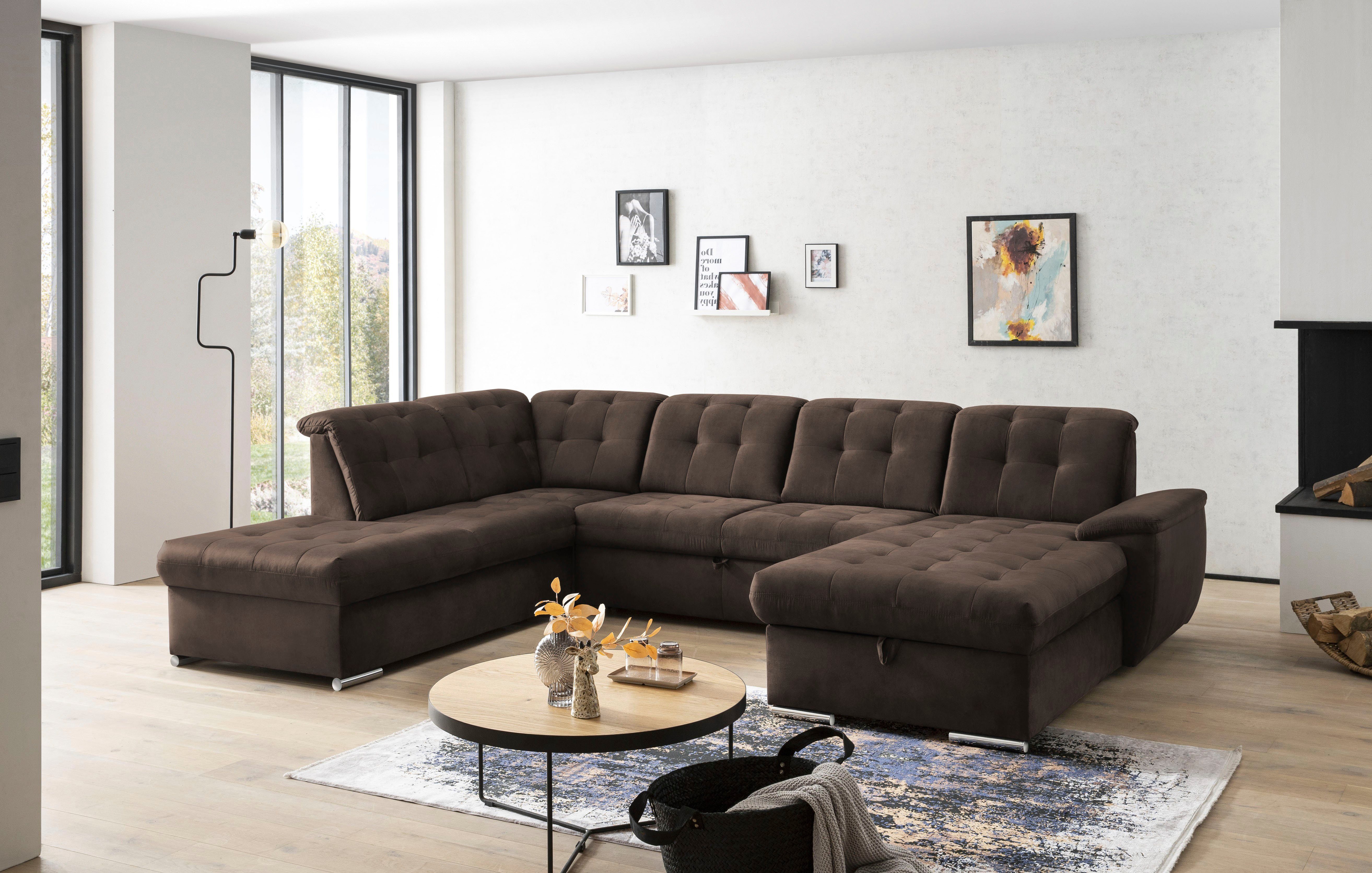Um ein echtes Platzwunder handelt es sich bei dieser Wohnlandschaft »Durango, aufwendige Sitz- und Rückenverarbeitung, bequem, U-Form« von exxpo - sofa fashion, das mit einem ausziehbaren Bettkasten versehen und somit Schlaf- und Ruhezone in einem ist. Bei der Wohnlandschaft befindet sich die Ottomane, von vorne betrachtet, auf der linken Seite. Gebrauchsspuren werden sich auf dem Bezug selbst nach langer Zeit kaum bemerkbar machen, denn der Webvelours ist sehr robust.