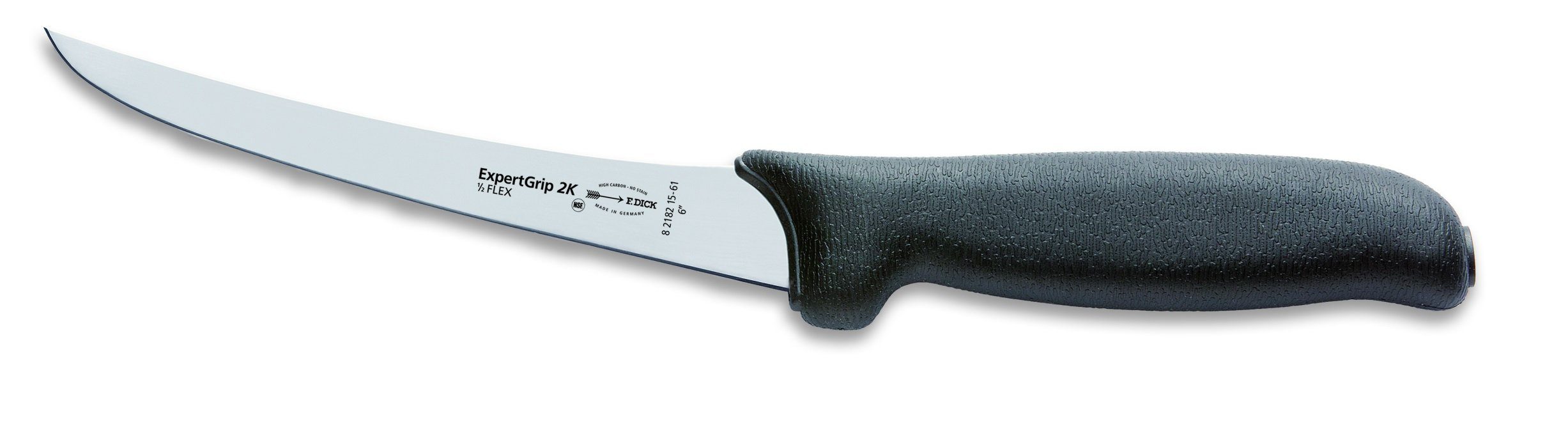 F. DICK Ausbeinmesser, semi-flexibel ExpertGrip 2K, 15cm, schwarz Das Ausbeinmesser aus der Serie ExpertGrip wird zum Auslösen von Knochen, also dem Trennen von Fleisch und Knochen verwendet. Die halb-flexible, dünne Klinge erlaubt exakte Schnitte, da sie sich an das Schneidgut anpasst. Das Messer kann ohne verkanten eng am Knochen geführt werden und ermöglicht damit eine hohe Fleischausbringung. Durch die geschwungene Klingenform ist die Schneide länger als bei geraden Messern, was einen langen, ziehenden Schnitt erlaubt.