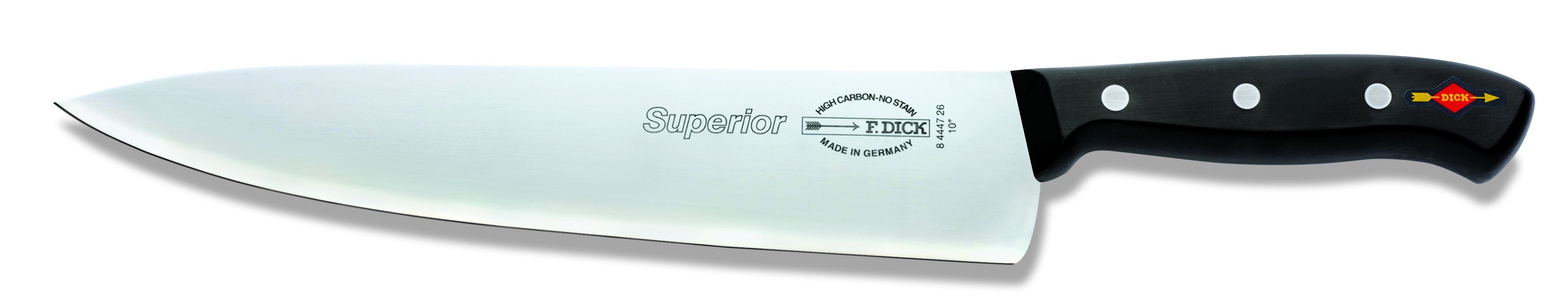 Klassiker und Herzstück der professionellen Küche. Das Kochmesser aus der Serie Superior ist der wichtigste Küchenhelfer für den vielseitigen Einsatz. Mit seiner 26 cm langen Klinge eignet es sich perfekt zum Schneiden von Kräutern und Gemüse, aber auch zum Zerteilen und Zerlegen von Fleisch und Fisch. Die geschwungene Schneide erleichert den Wiegeschnitt. Die Superior Serie ist für den Einsatz im professionellen Bereich konzipiert. Klassisches Design mit Griffnieten und die leichte Ausführung ergeben ein Messer in morderner Form und Funktion. Klinge und Griff sind ohne Spalt fest miteinander verbunden, dank dem durchgehenden Stahl bis zum Griffende wird eine hohe Stabilität erreicht. Das Nachschärfen der gesamten Schneide ist möglich. Klinge ist aus X55CrMo14 Stahl. Die ausgewogene Härte von 56° HRC ist der ideale Kompromiss für perfekte Schnitthaltigkeit und leichtes Nachschärfen. Made in Germany.