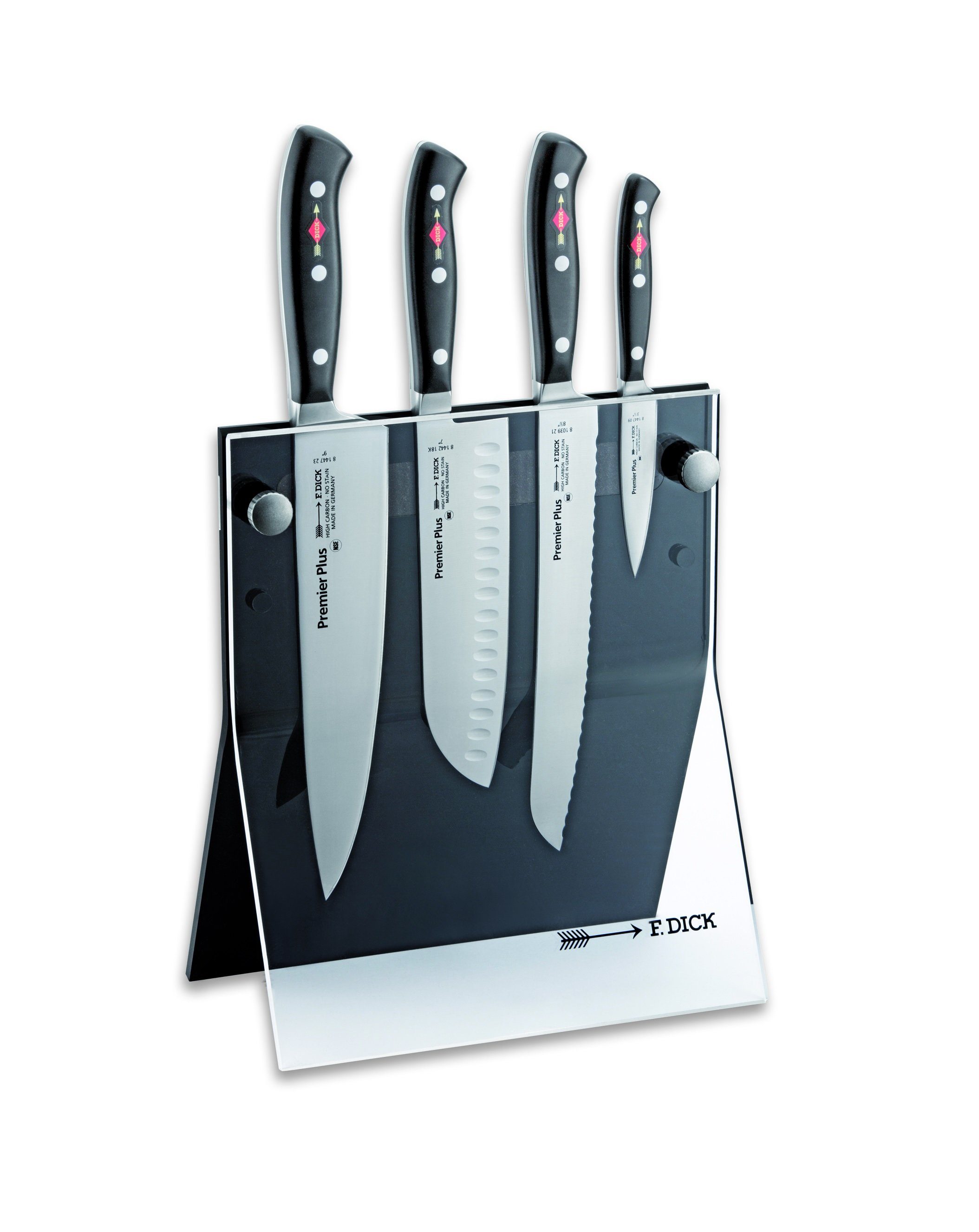 Der Messerblock wird aus hochwertigem Acrylglas hergestellt. Die eingearbeitete Magnetleiste fixiert die Messerklingen. Die geschmiedeten Messer der Serie Premier Plus mit dem traditionellen, dreifach genieteten, Griff erfreuen sich großer Beliebtheit sowohl bei Profi-, wie auch bei Hobbyköchen.