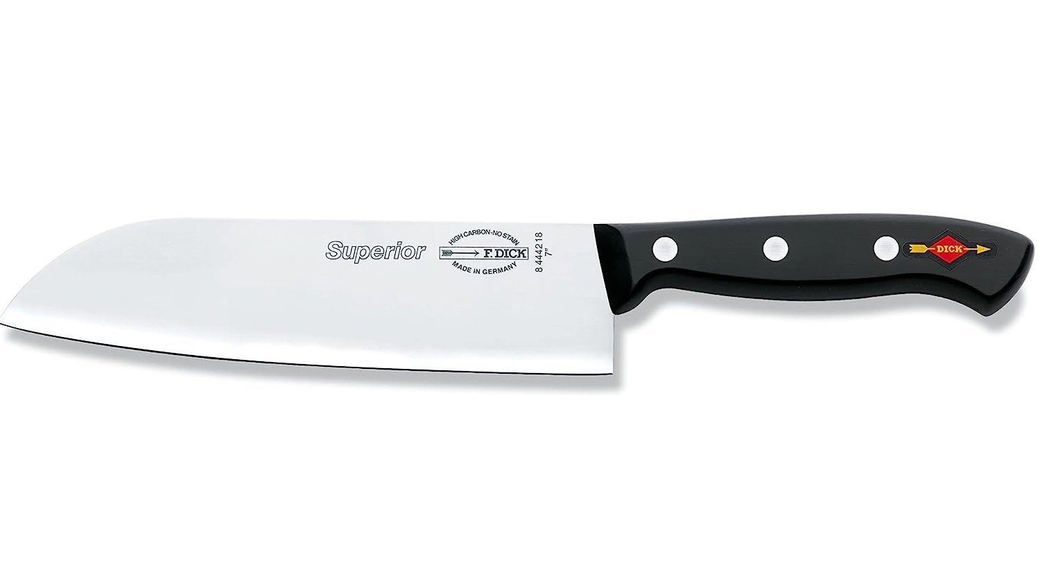 Das Santoku aus der Serie Superior gilt als asiatischer Klassiker für Gemüse und Fleisch und gehört damit zum Basissortiment in der Küche. Es zeichnet sich durch eine dünne, 18 cm lange Klinge mit keilförmigem Anschliff aus. Das spitze Klingenende dient zum Dekorieren. Die Superior Serie ist für den Einsatz im professionellen Bereich konzipiert. Klassisches Design mit Griffnieten und die leichte Ausführung ergeben ein Messer in morderner Form und Funktion. Klinge und Griff sind ohne Spalt fest miteinander verbunden, dank dem durchgehenden Stahl bis zum Griffende wird eine hohe Stabilität erreicht. Das Nachschärfen der gesamten Schneide ist möglich. Klinge ist aus X55CrMo14 Stahl. Die ausgewogene Härte von 56° HRC ist der ideale Kompromiss für perfekte Schnitthaltigkeit und leichtes Nachschärfen. Made in Germany.