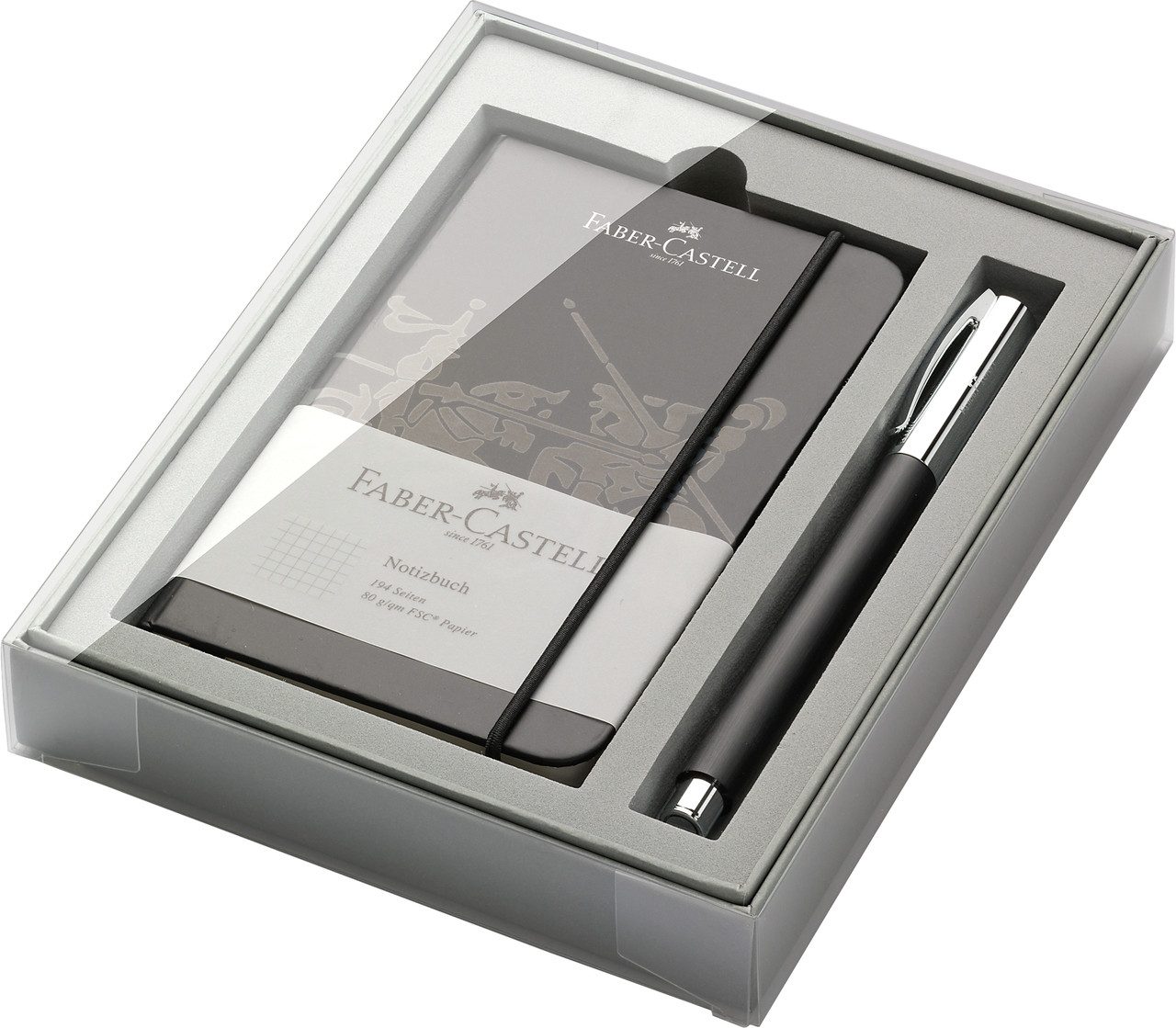Lieferumfang | 1x Faber-Castell Schreibset, Ambition Tintenroller Edelharz schwarz, Notizbuch A6, Geschenkverpackung |