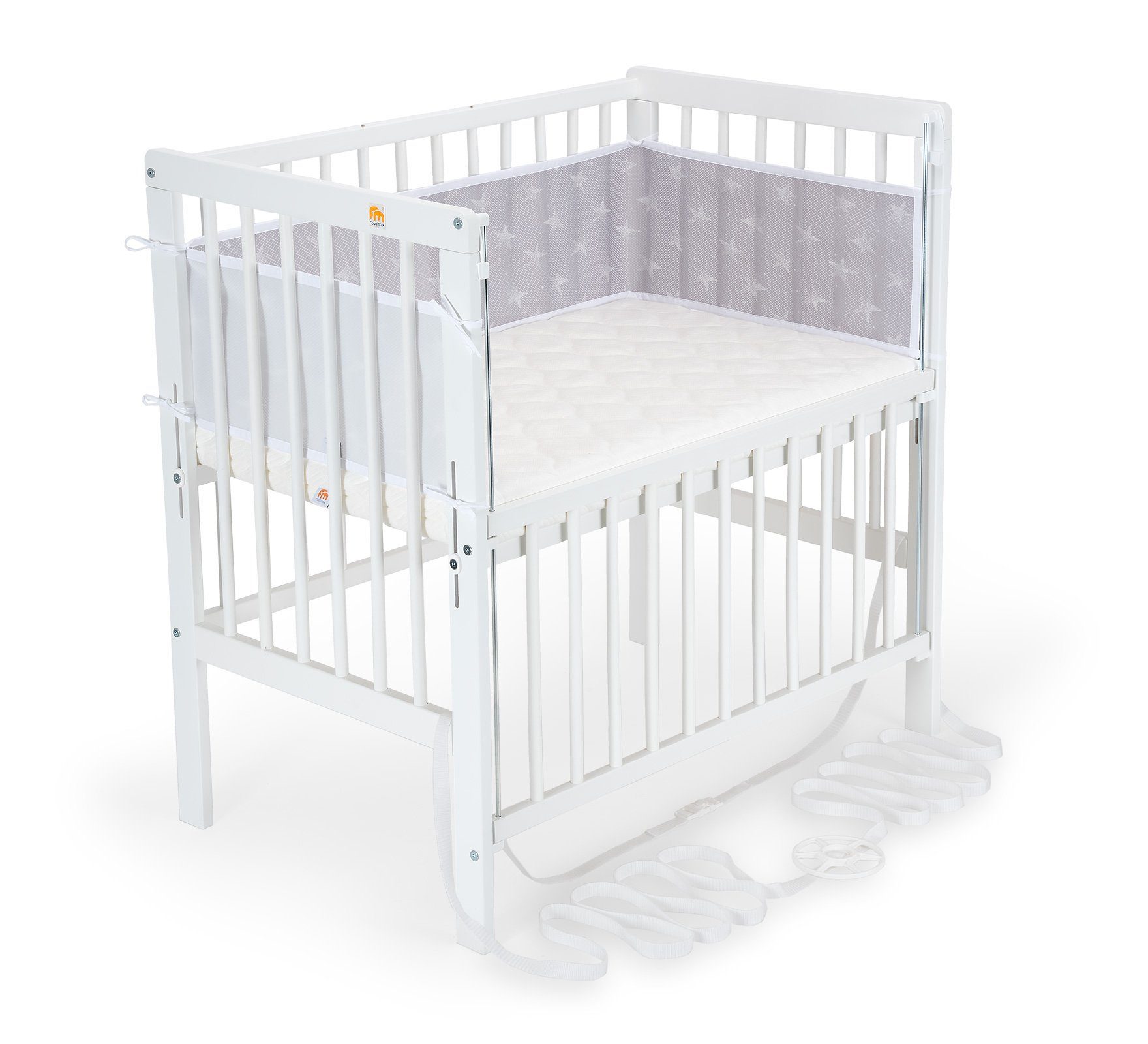Das Beistellbett ist aus stabilem und langlebigem Buchenholz gefertigt und gewährleistet durch seinen Lattenrost eine ideale Luftzirkulation. Das Babybett ist in den Farben grau und weiß verfügbar. Wir verwenden ausschließlich Lacke die gemäß DIN-EN 71-3 (Sicherheit von Spielzeug) zertifiziert sind. Diese Norm bestimmt, welche Stoffe in Farben und Lacken sein dürfen, damit sie sicher für Kinder sind. Zur Auswahl stehen drei hochwertige Matratzen: